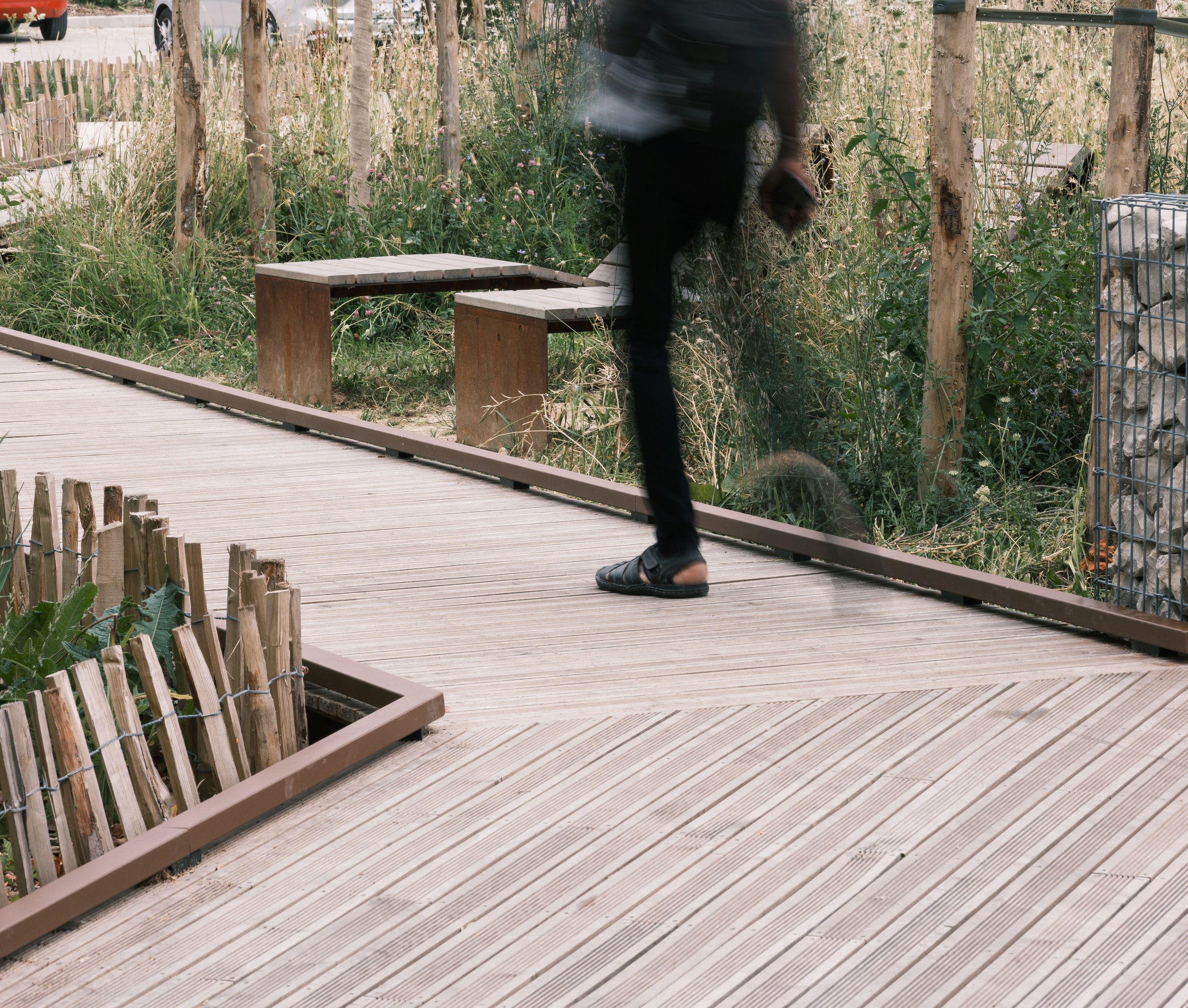 L’espace est agencé de manière à réintroduire de la pleine-terre et proposer plusieurs milieux humides. La partie ouest du site consiste en une réserve de biodiversité tandis que deux jardins, l’un sec et l’autre humide, se dessinent de part et d’autre de la place Claude Monet. Par ailleurs, des ouvrages de type noues ou espaces inondables participent désormais à la gestion alternative des eaux pluviales. Un bassin roselière vient compléter ce dispositif et constituer le point final du ruissellement des eaux.