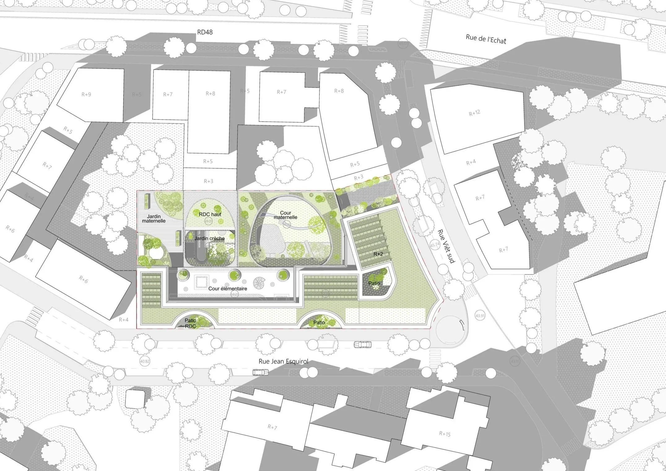 Le projet paysager du groupe scolaire du Triangle de l’Échat vise à créer un cadre à la fois écologique et pédagogique, propice à la biodiversité et à l’apprentissage. Il mise sur une végétalisation importante des cours avec des arbres de haute tige pour l’ombre, des plantations en quatre strates, des sols perméables et une gestion intégrée de l’eau, notamment via un ruisseau ludique dans la cour maternelle. Des aménagements spécifiques (nichoirs, refuges, toitures végétalisées) favorisent l’accueil de la faune.