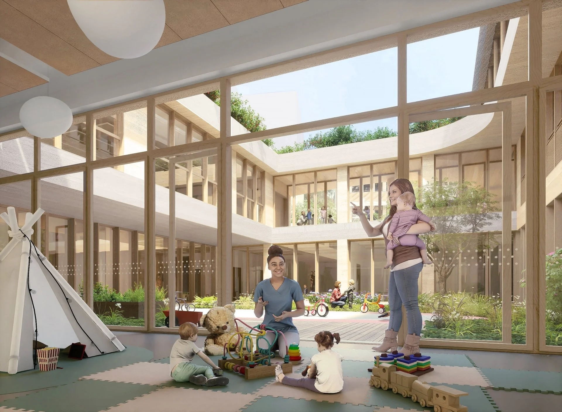 La cour de la crèche s’organise autour d’un grand patio central, avec une piste de motricité, une pelouse d’expérimentation et une bande plantée visible depuis l’intérieur.