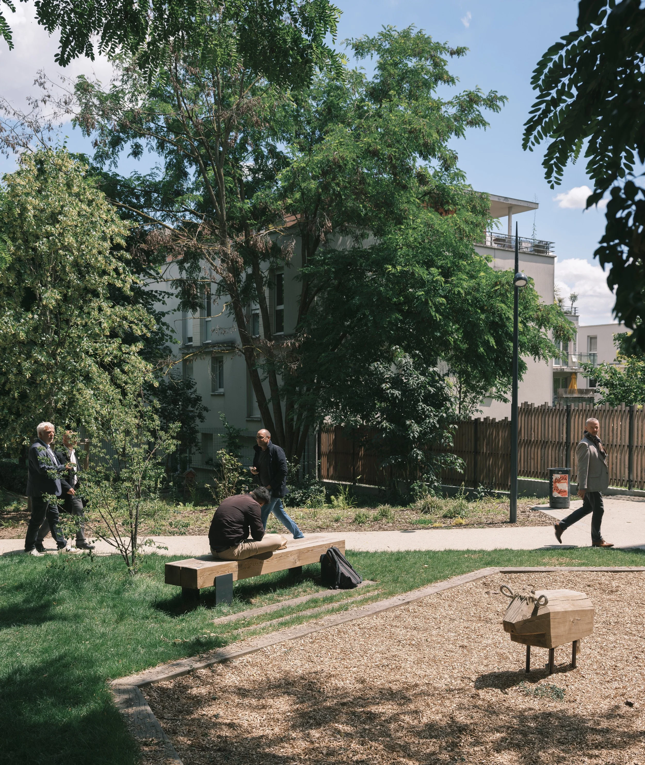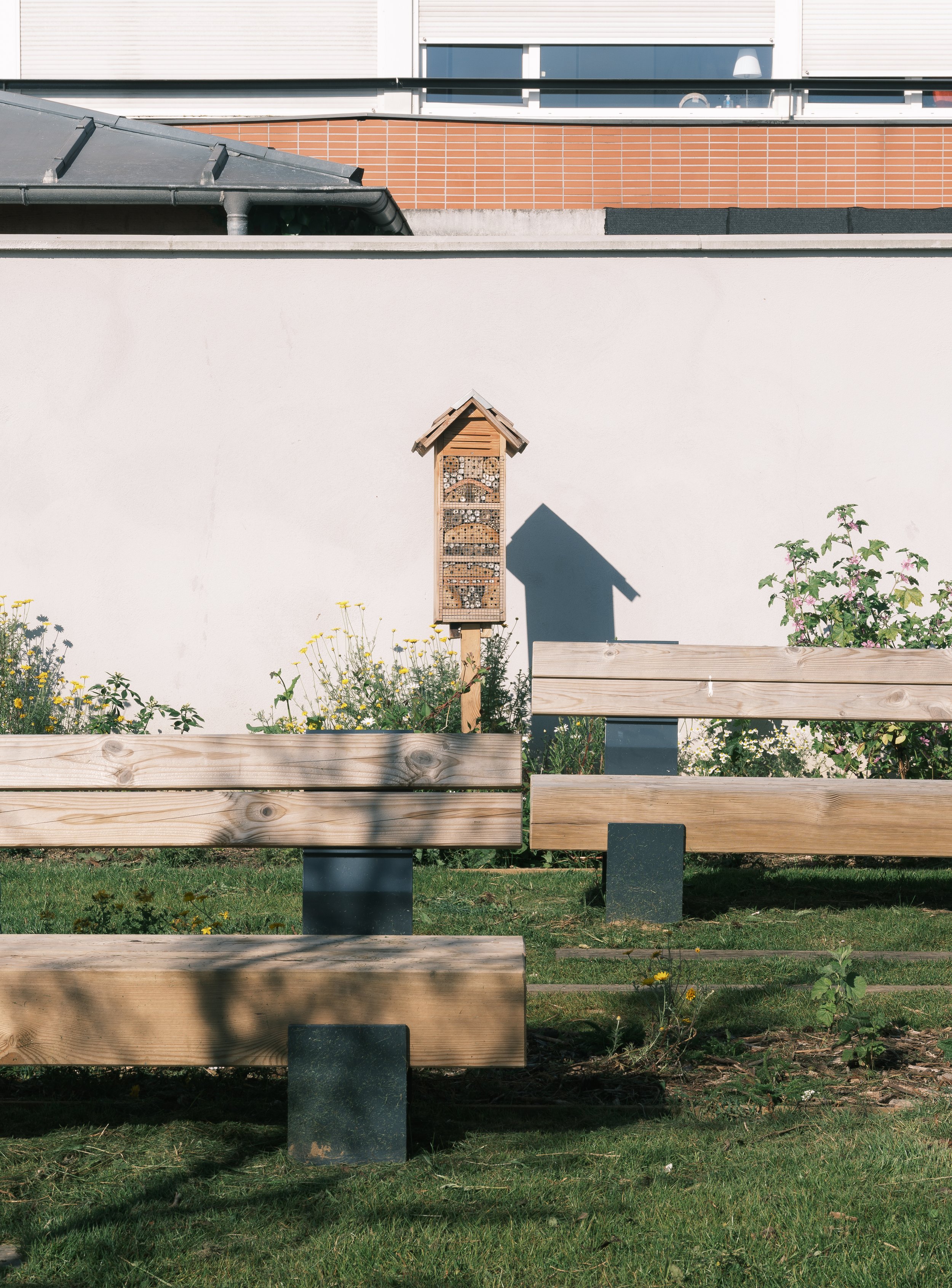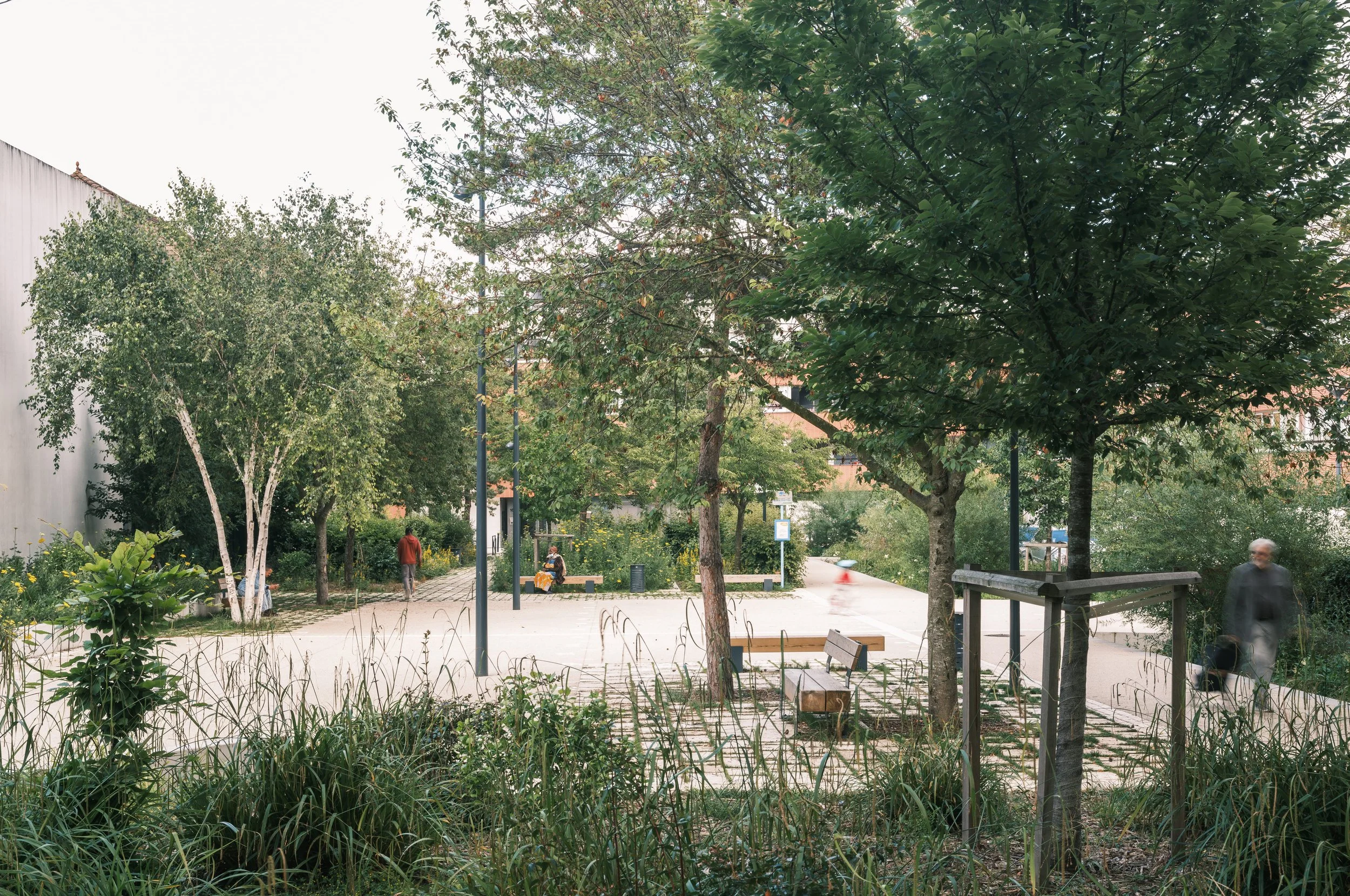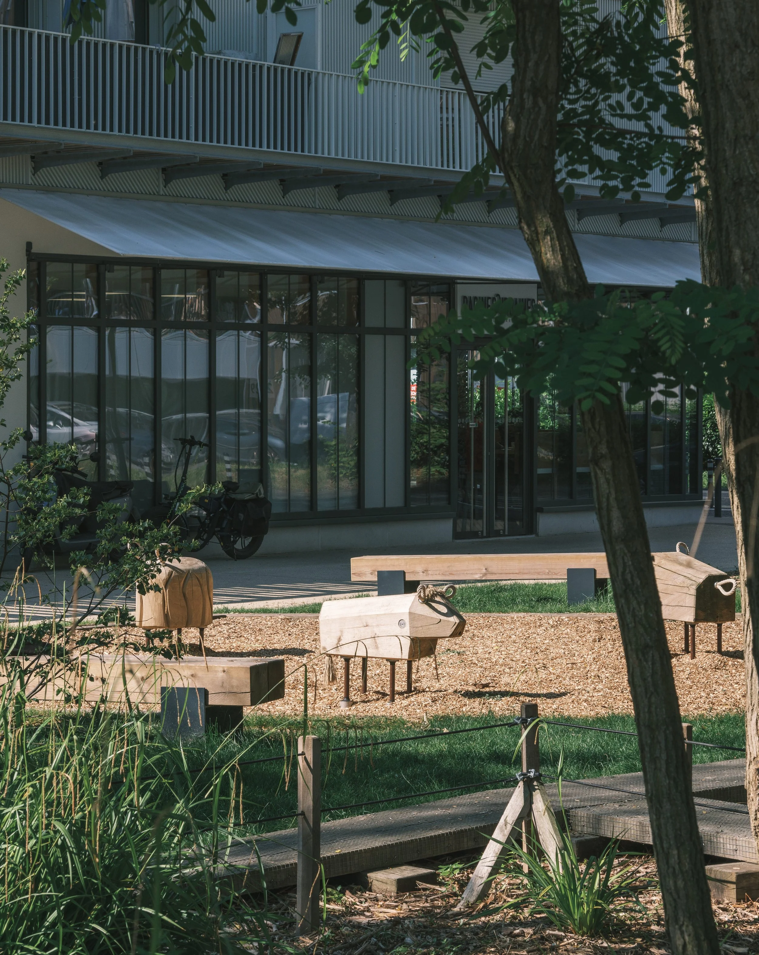 Le mobilier introduit constitue quant à lui le « fil rouge » du projet suggérant des espaces de circulations encadrant les divers usages. Par ailleurs, le site se trouvant à proximité d’un équipement scolaire, plusieurs aires de jeux ludiques autour de la Nature sont aménagées. Des potagers sont à disposition des habitant.e.s et des enfants. Et, devant le parvis de l’école, un milieu sous-bois édifie un véritable refuge de biodiversité, au plus grand plaisir des enfants.