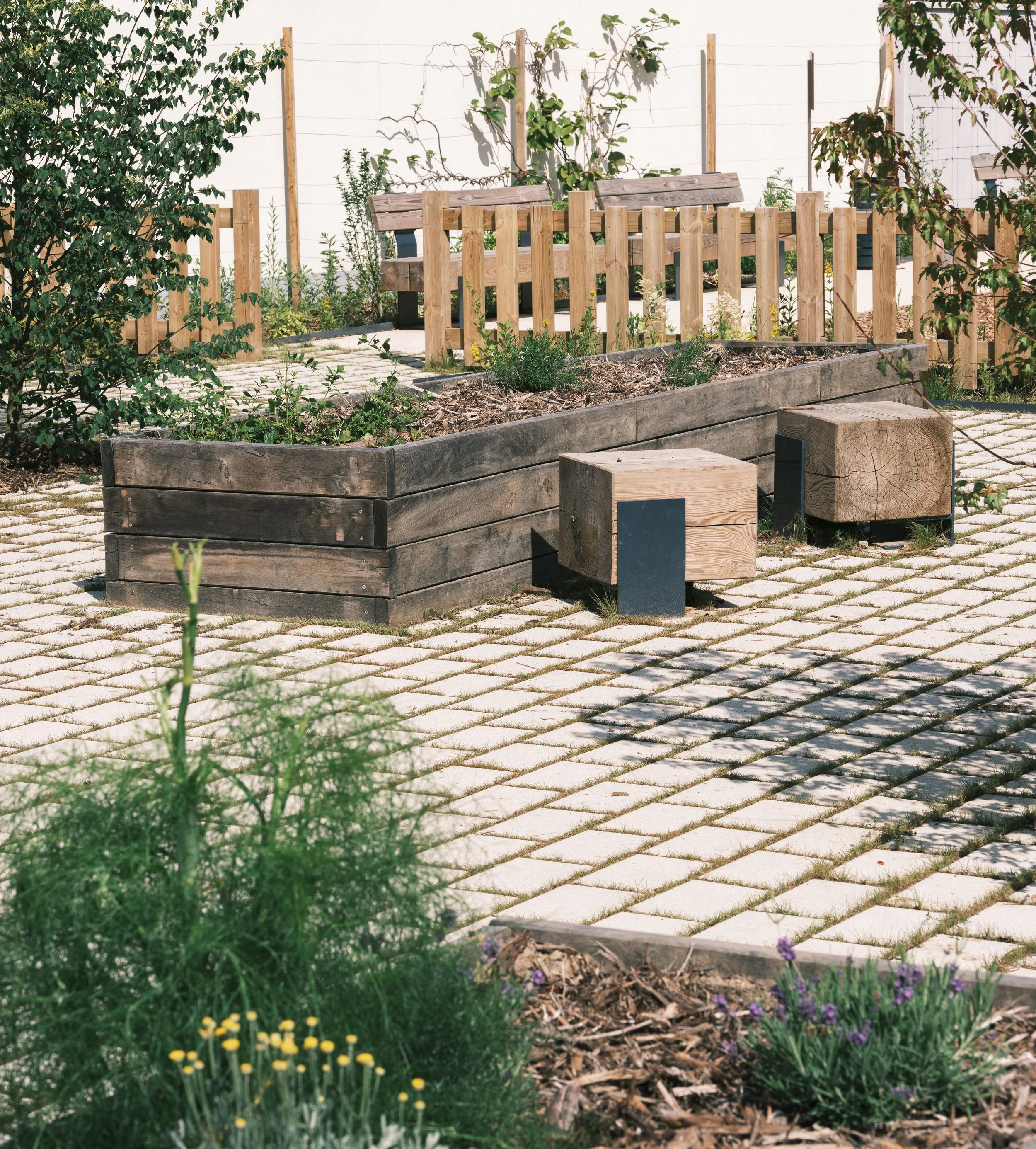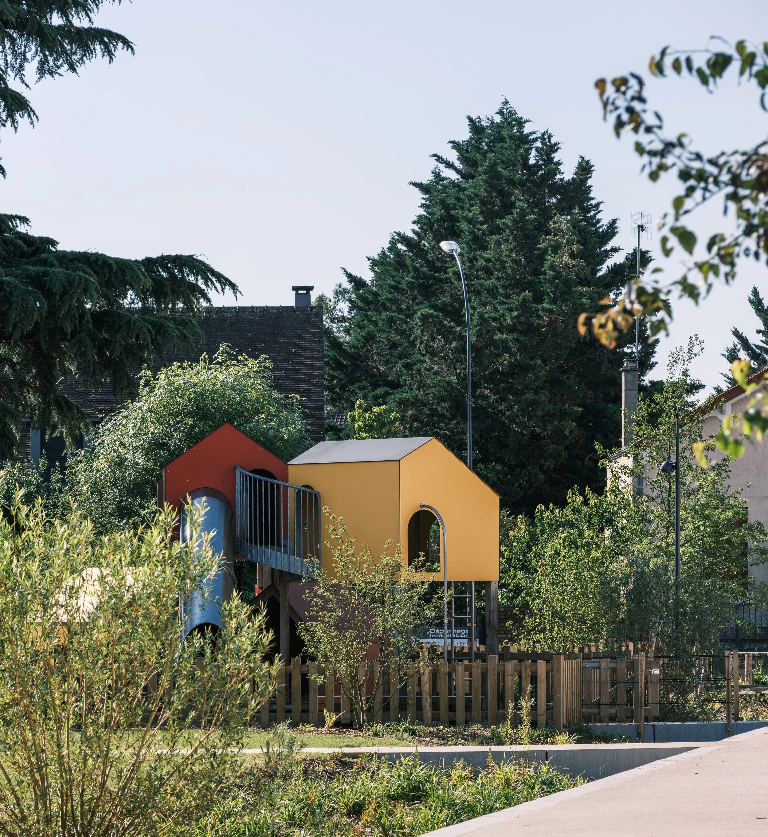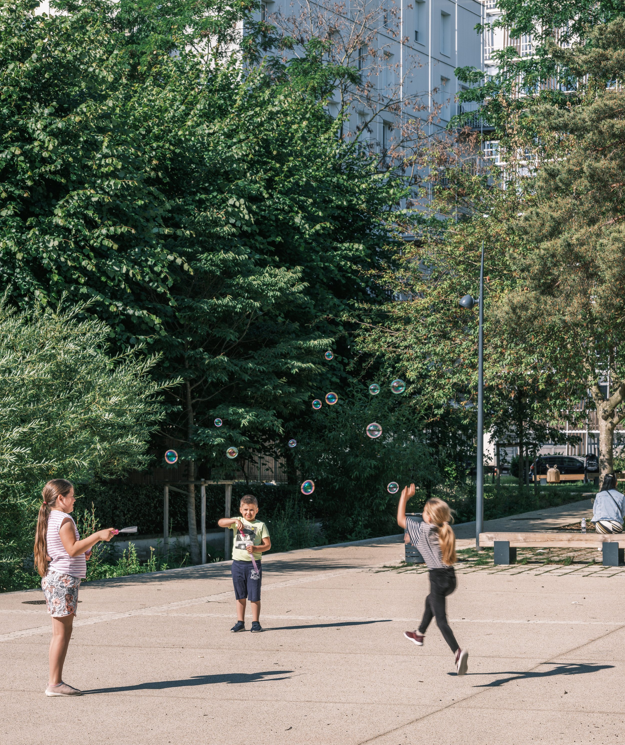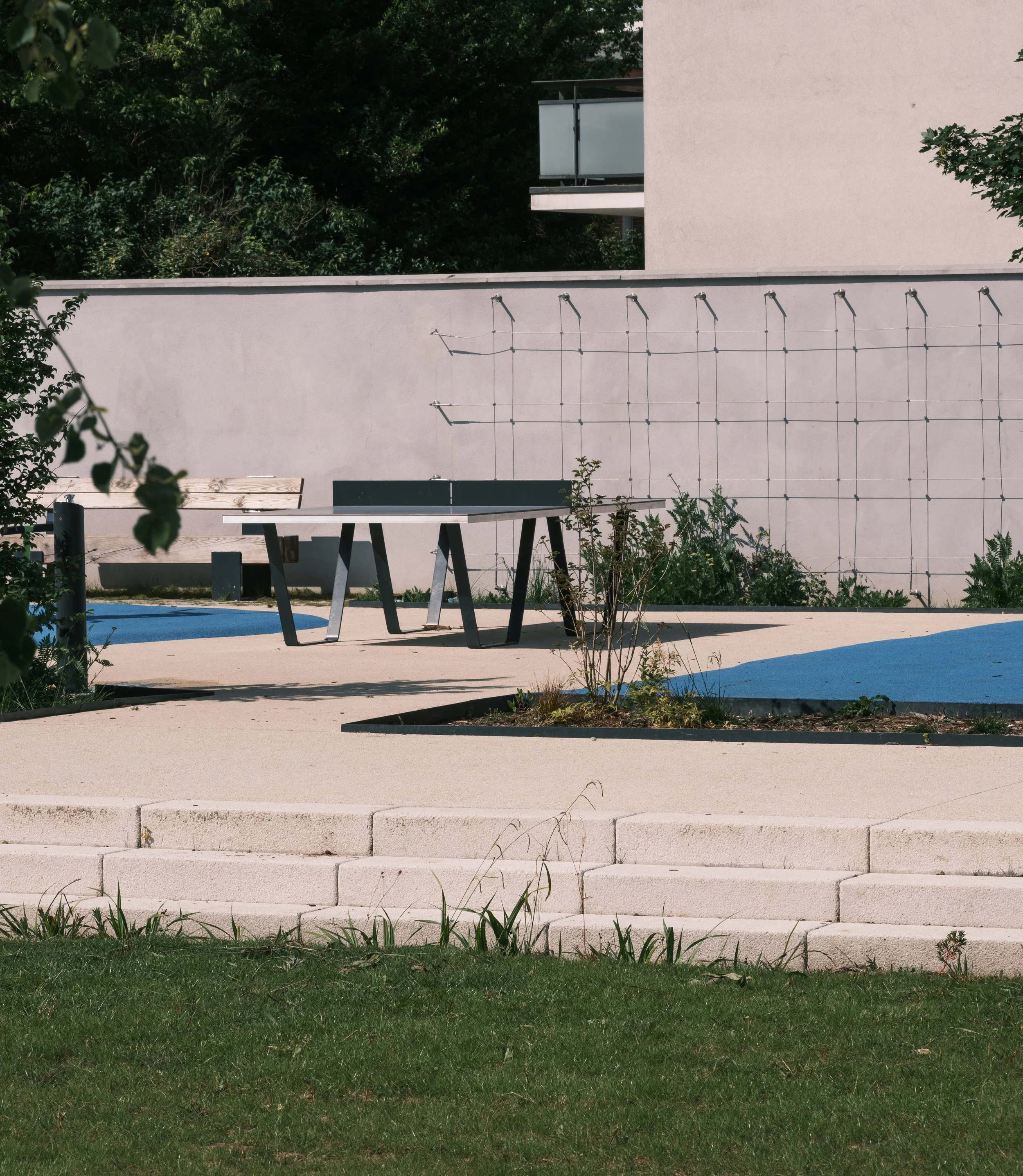 Le mobilier introduit constitue quant à lui le « fil rouge » du projet suggérant des espaces de circulations encadrant les divers usages. Par ailleurs, le site se trouvant à proximité d’un équipement scolaire, plusieurs aires de jeux ludiques autour de la Nature sont aménagées. Des potagers sont à disposition des habitant.e.s et des enfants. Et, devant le parvis de l’école, un milieu sous-bois édifie un véritable refuge de biodiversité, au plus grand plaisir des enfants.