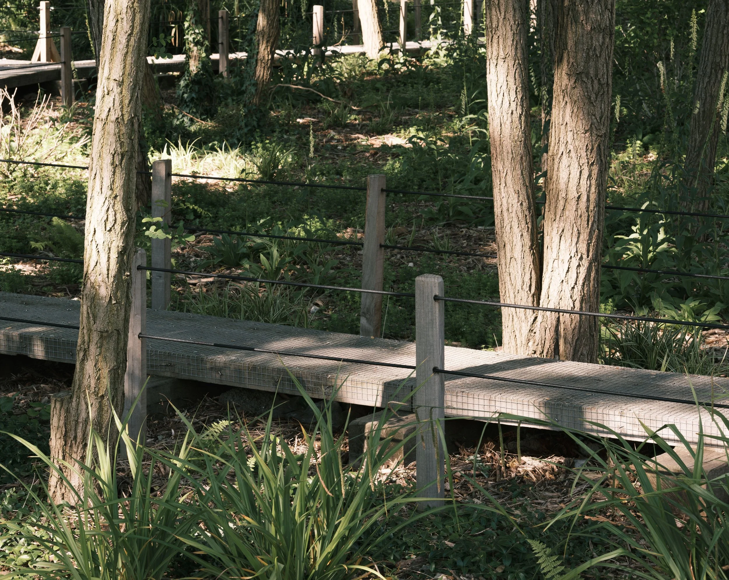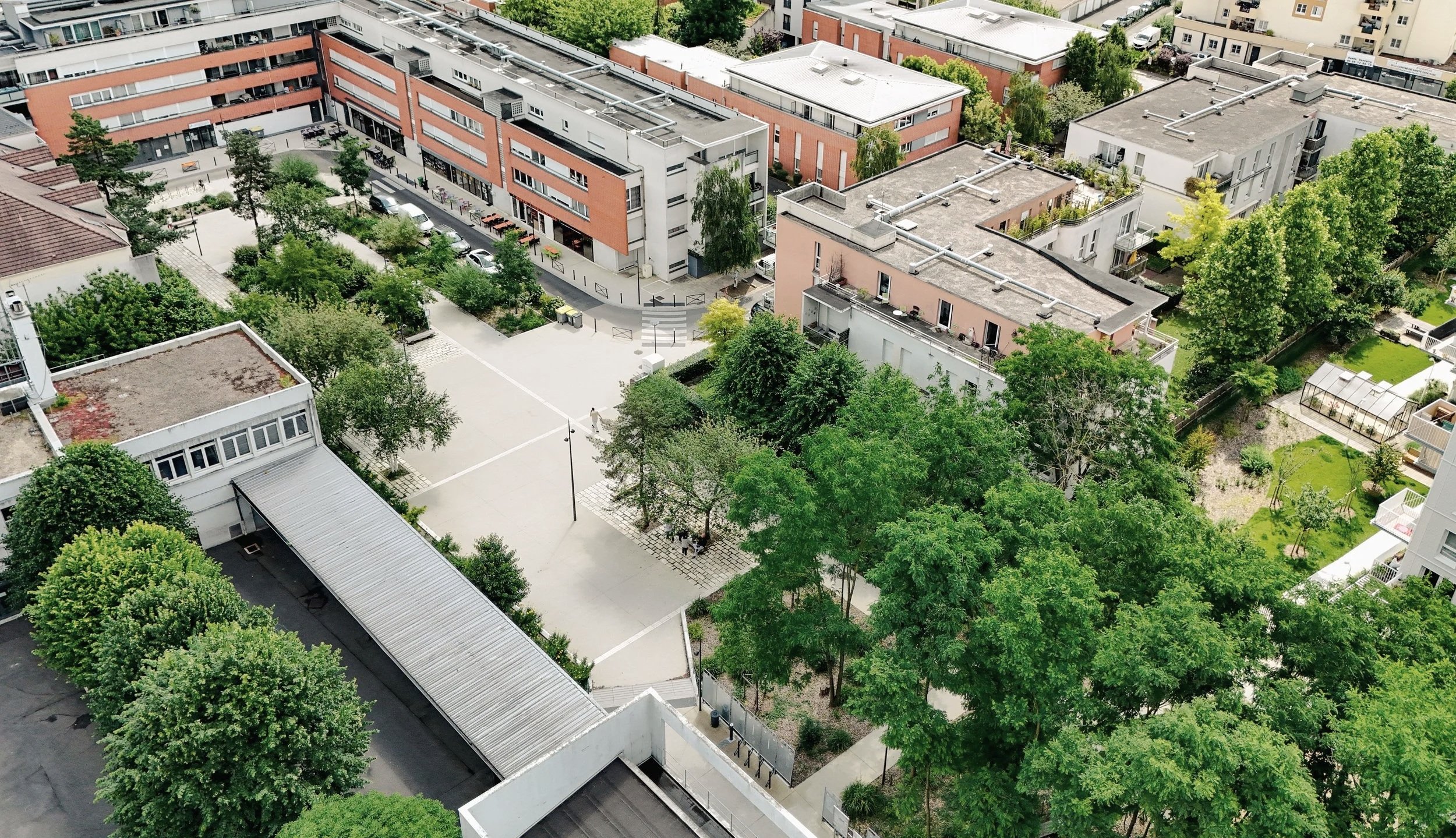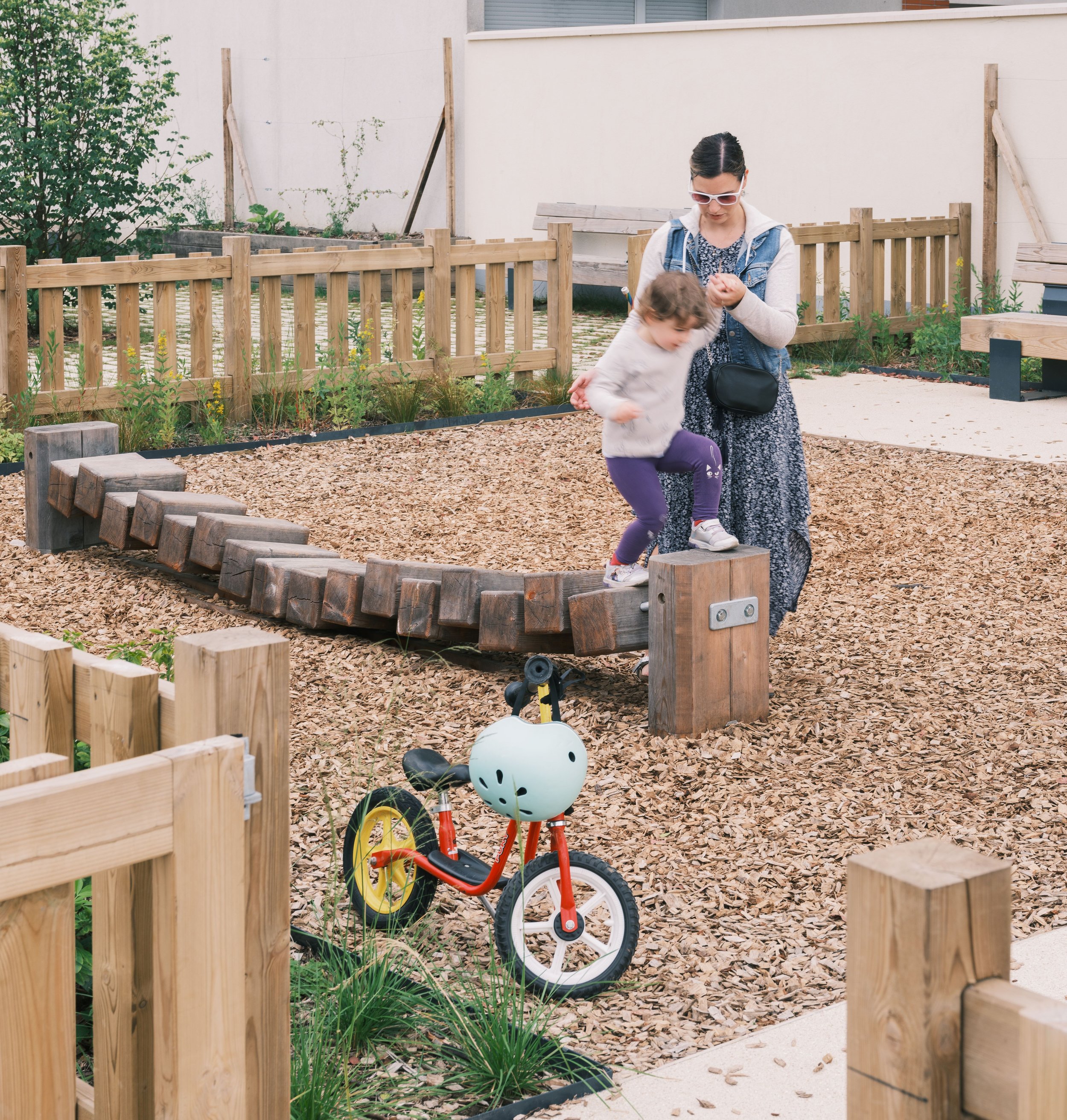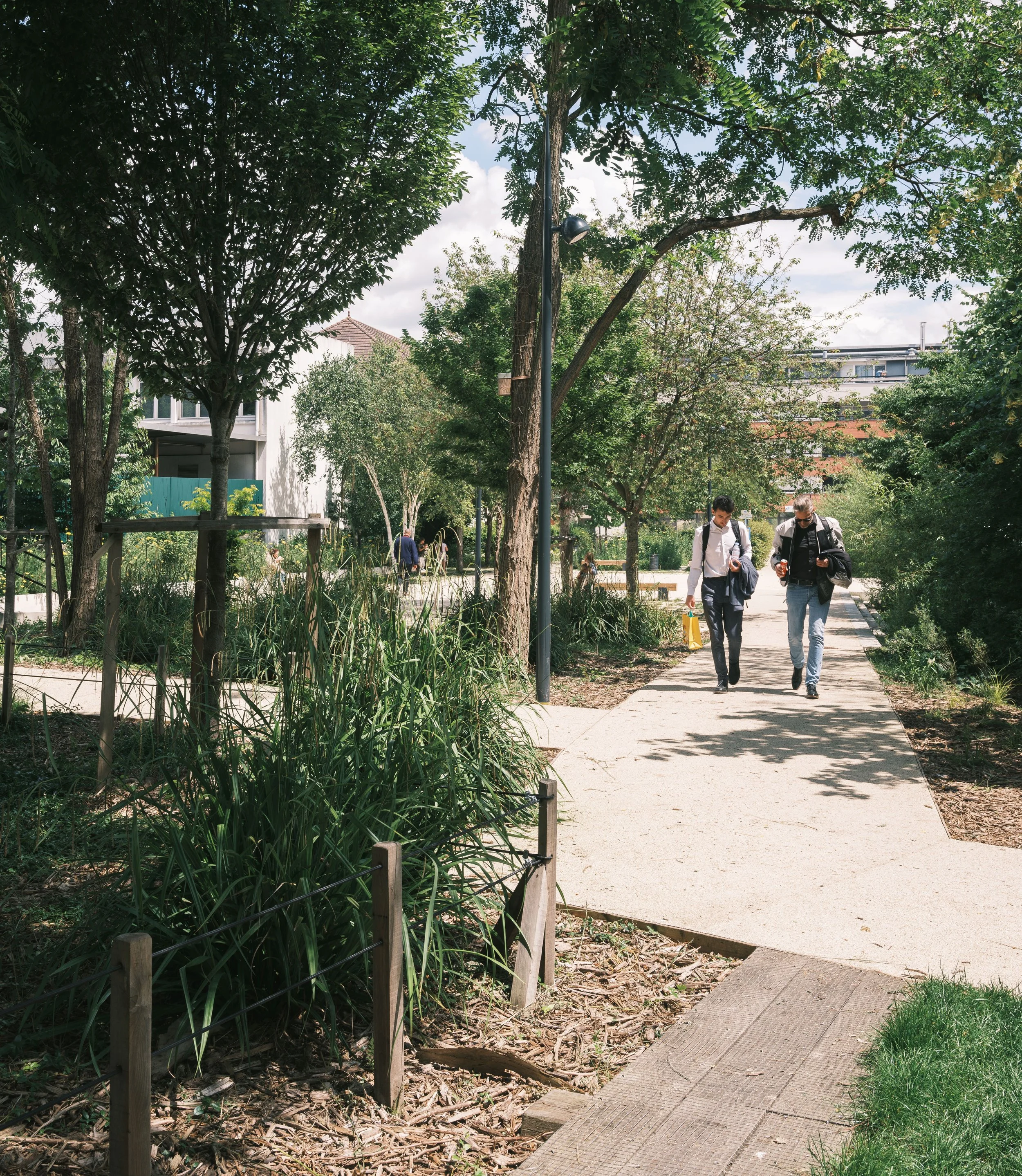 Le mobilier introduit constitue quant à lui le « fil rouge » du projet suggérant des espaces de circulations encadrant les divers usages. Par ailleurs, le site se trouvant à proximité d’un équipement scolaire, plusieurs aires de jeux ludiques autour de la Nature sont aménagées. Des potagers sont à disposition des habitant.e.s et des enfants. Et, devant le parvis de l’école, un milieu sous-bois édifie un véritable refuge de biodiversité, au plus grand plaisir des enfants.