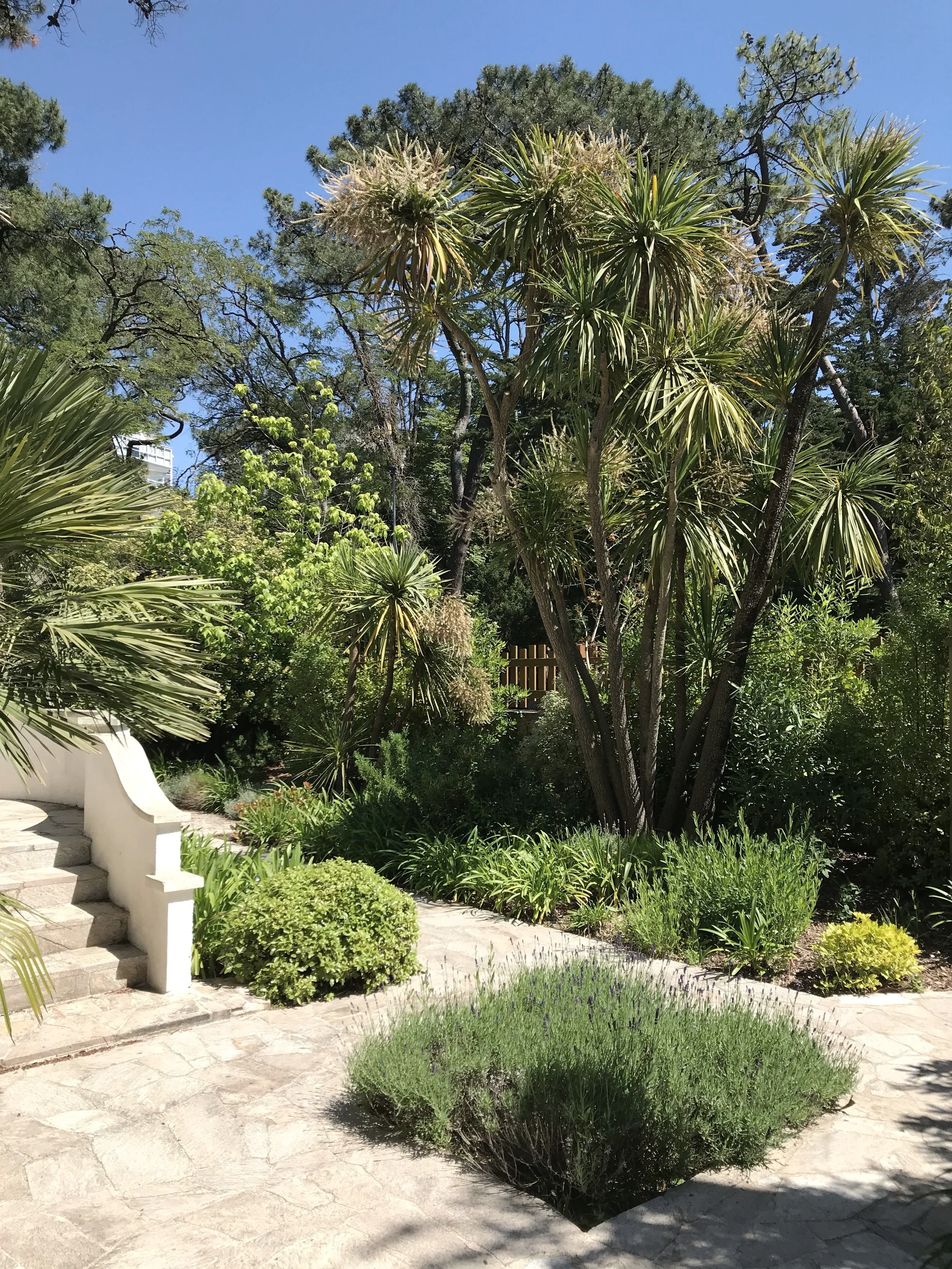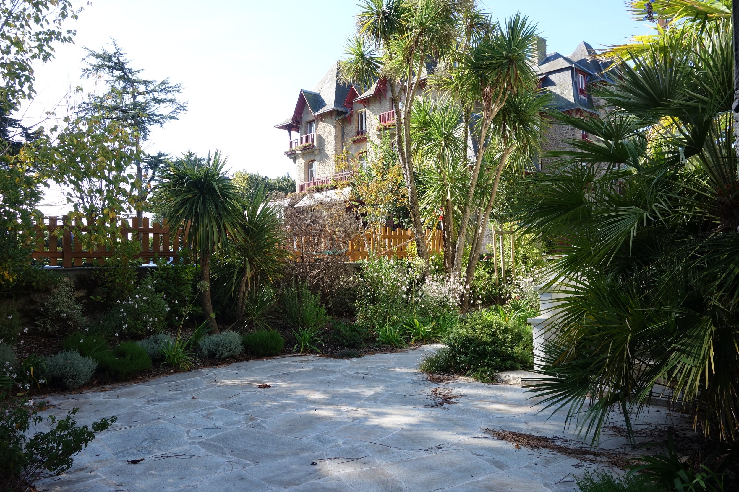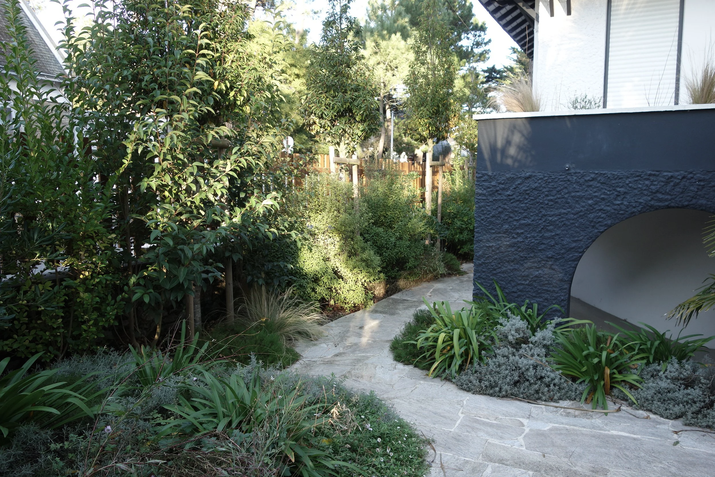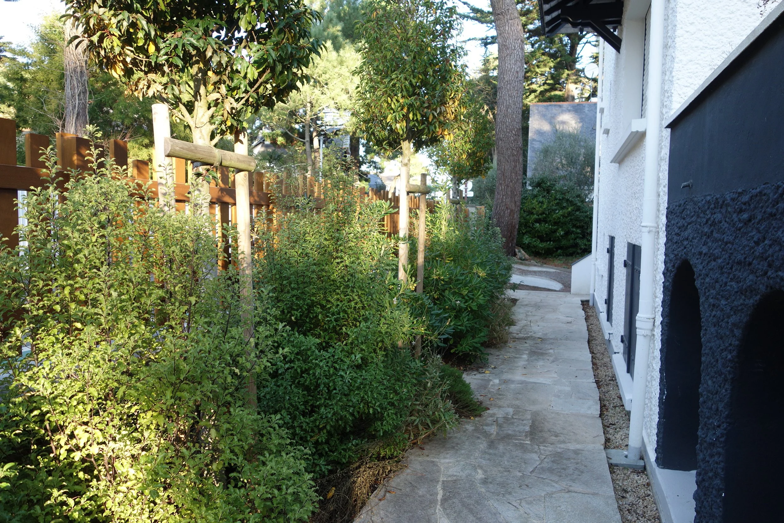Petit jardin urbain donnant sur une rue en prise direct avec le front de mer, c’est le parvis situé en hauteur au seuil de la maison qui constitue l’espace vivant du lieu. Le jardin forme un espace d’accompagnement vers l’intime.
