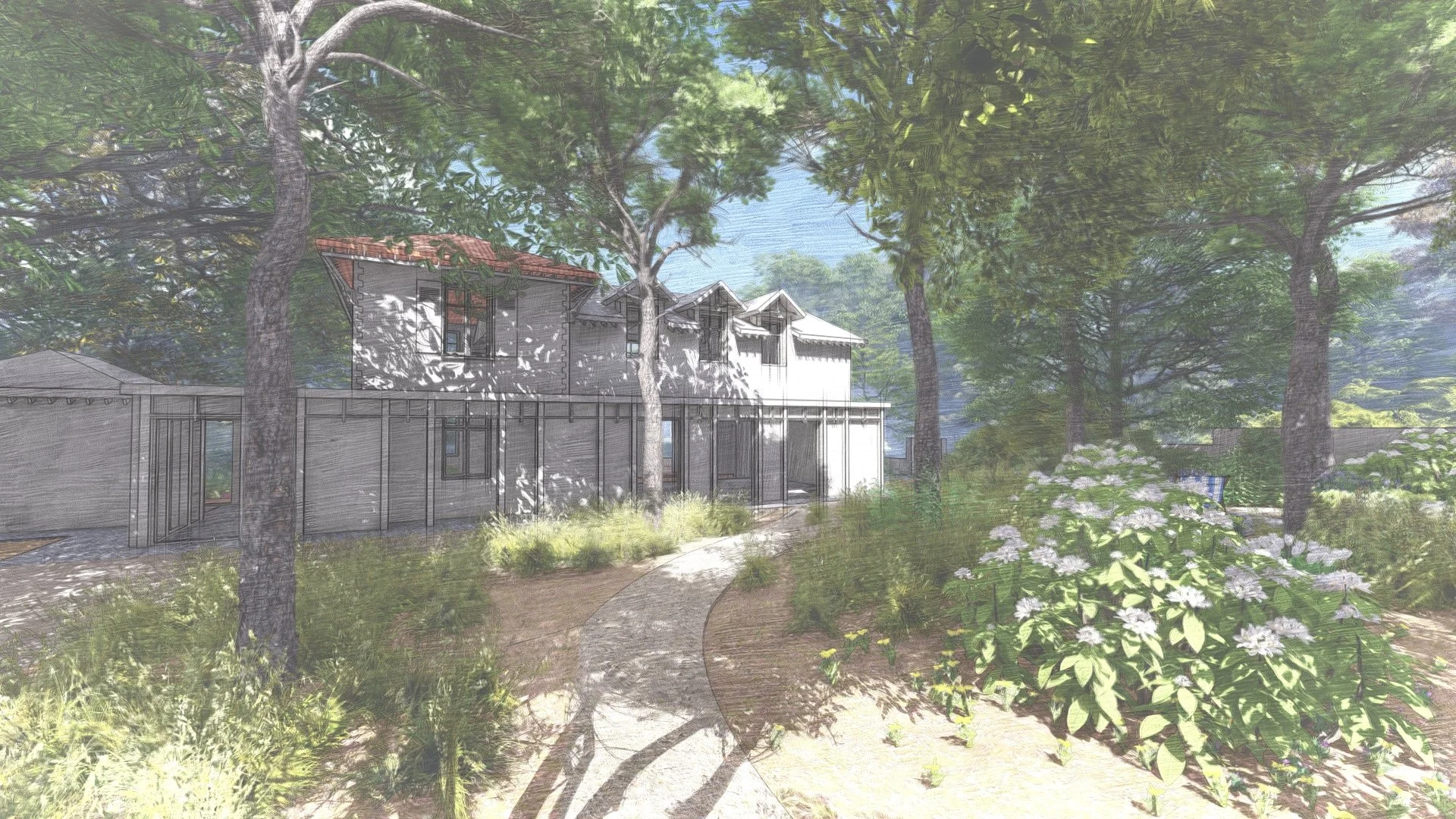 La conception prend soin de minimiser l’impact du bâti, de protéger la façade sud de la surchauffe estivale et d’optimiser la ventilation naturelle, tout en offrant des perspectives dégagées sur le parc arboré et la mer. Chaque élément végétal et minéral est pensé pour créer un dialogue harmonieux entre nature et architecture, faisant des extérieurs un véritable prolongement du cadre de vie.
