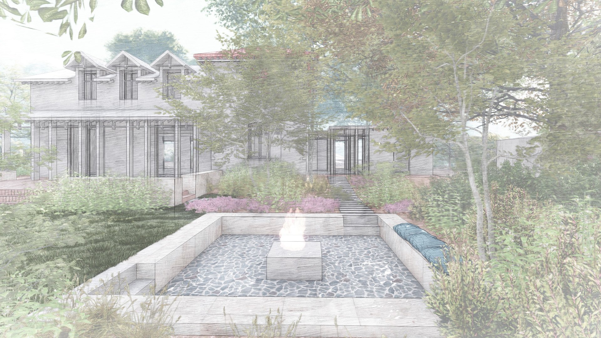 Programme : Cheminements / Terrasse / Zone d’intimité / Palette végétale / Boulodrome / Zone de stationnement / Limites plantées / Pièce d’eau