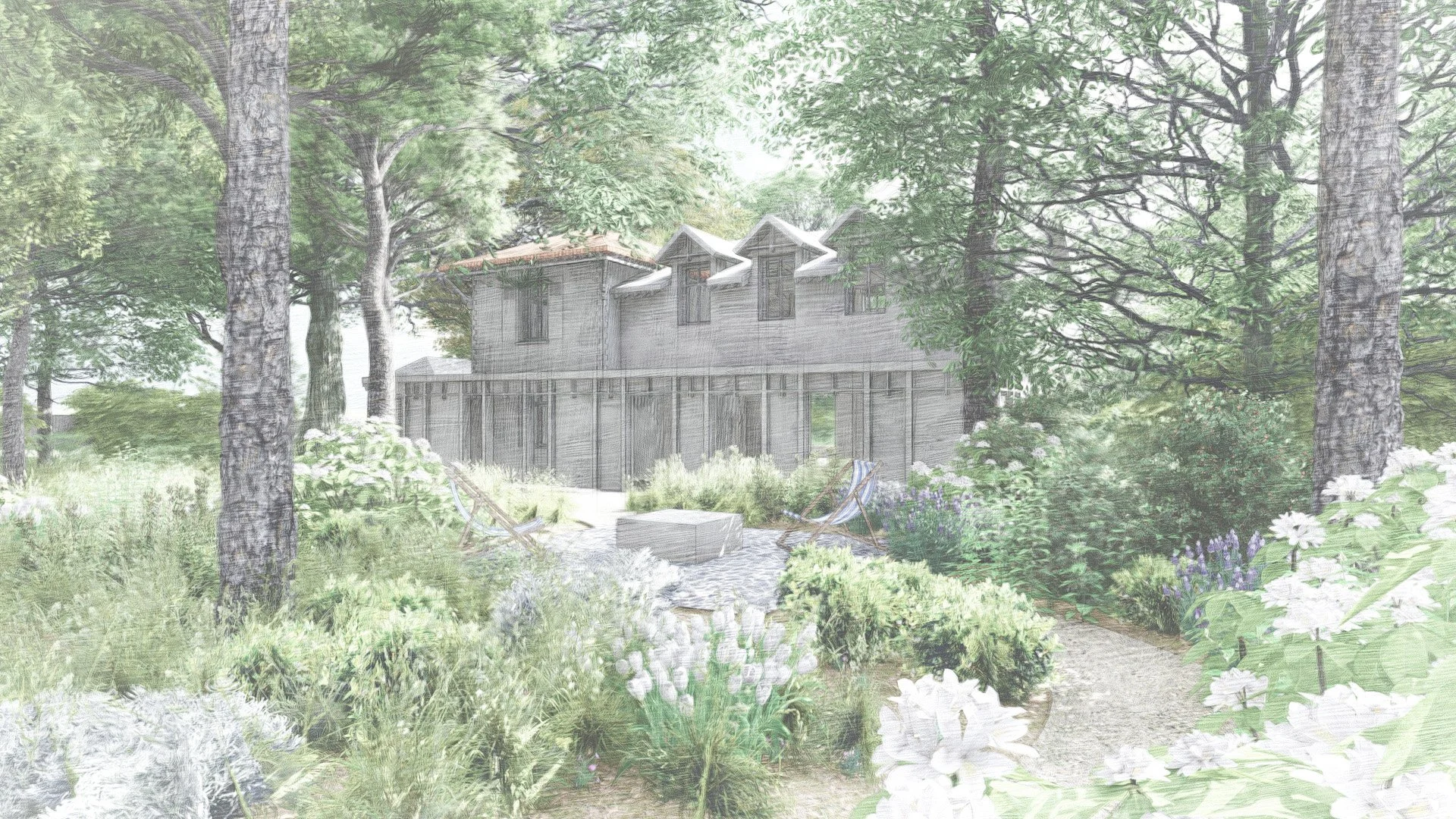 La végétation existante est valorisée : les arbres conservés accueillent des plantations basses et fleuries, formant un sous-bois visible depuis l’entrée et la cuisine, et orientant le regard vers la mer. Des espaces de repos avec pièce d’eau et salon ombragé, ainsi qu’un terrain de pétanque sous le mimosa, créent des ambiances variées pour la détente et le jeu.