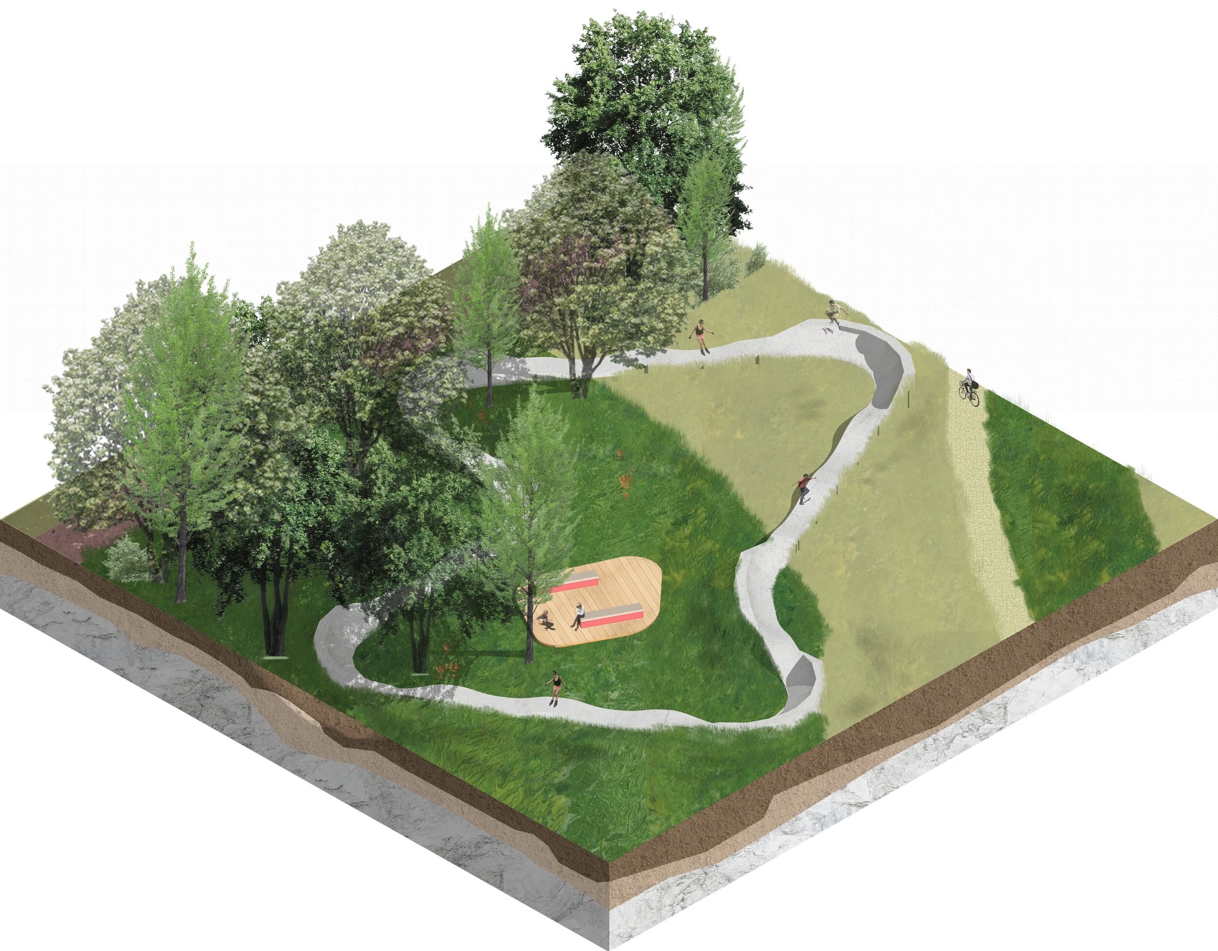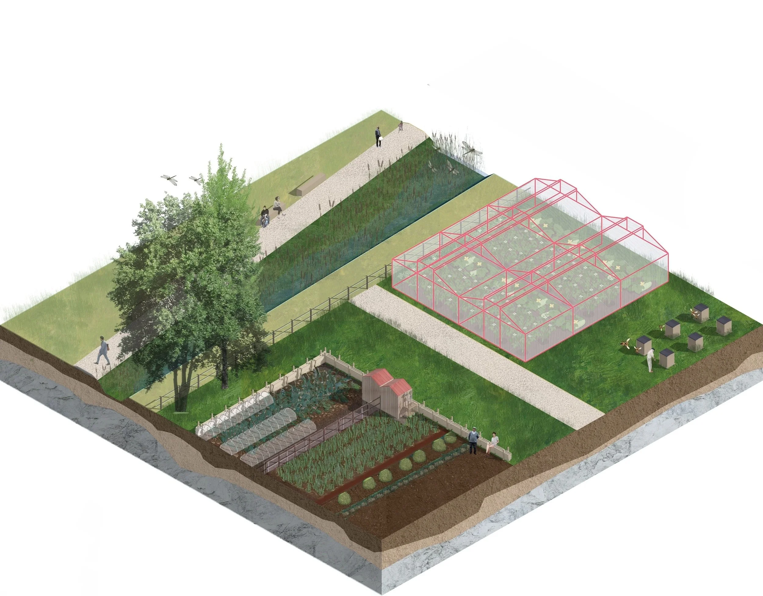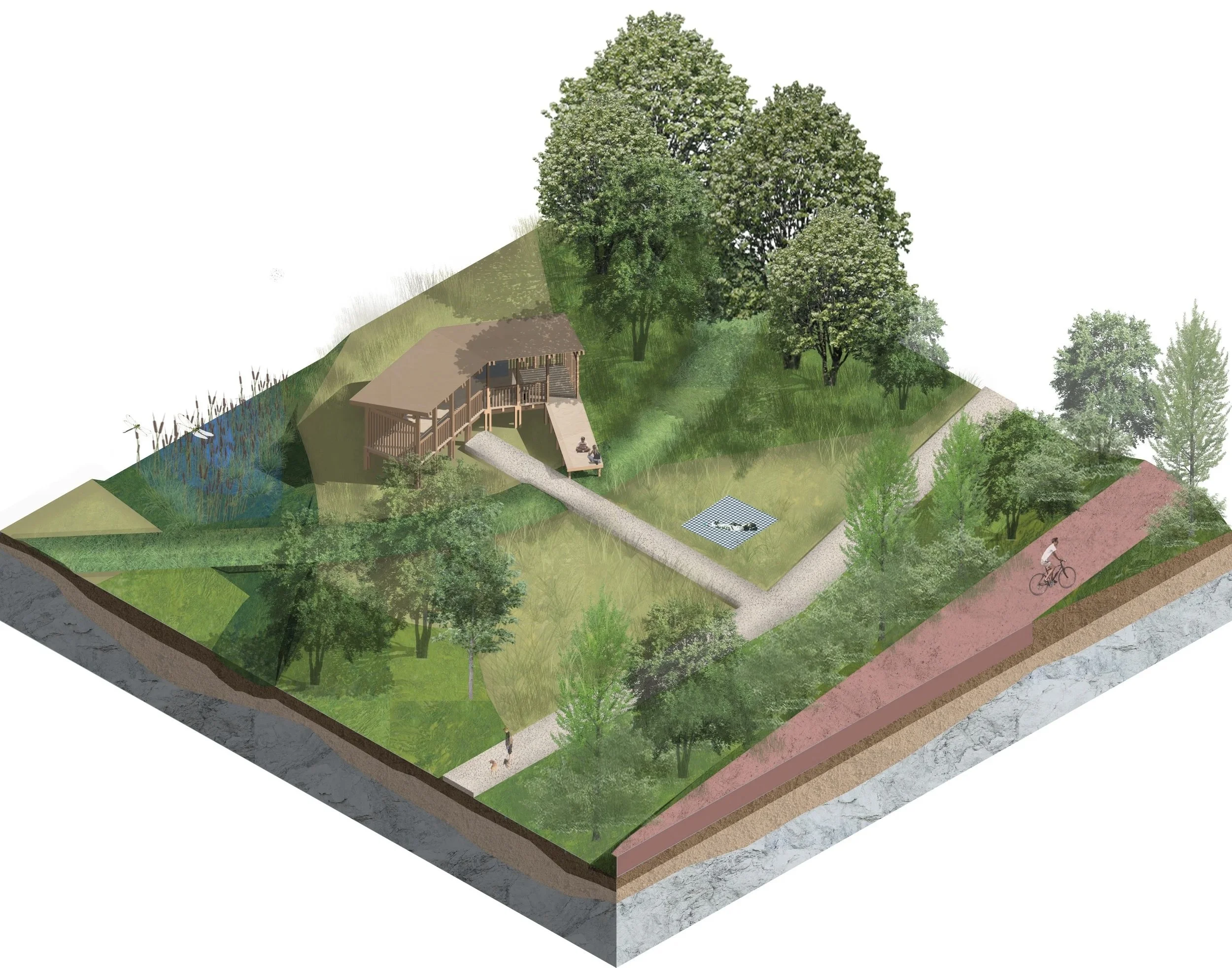 Notre plan de composition repose sur quatre thèmes : le sol, l’eau, le végétal et les usages, afin de mettre en musique le vivant souvent invisible. L’objectif est double : offrir aux habitants un lieu de vie et créer un espace naturel riche en biodiversité et en fonctions écologiques.