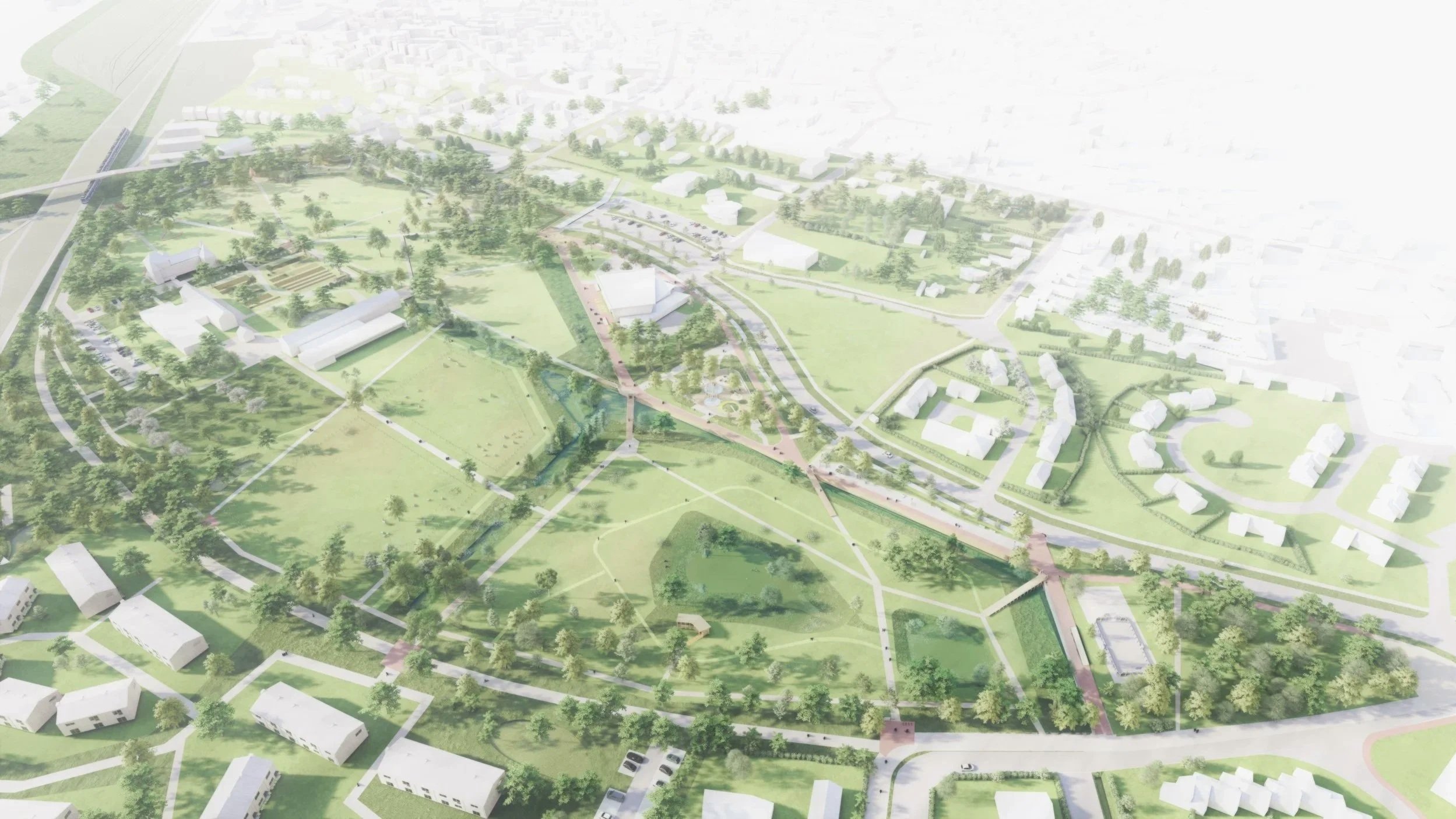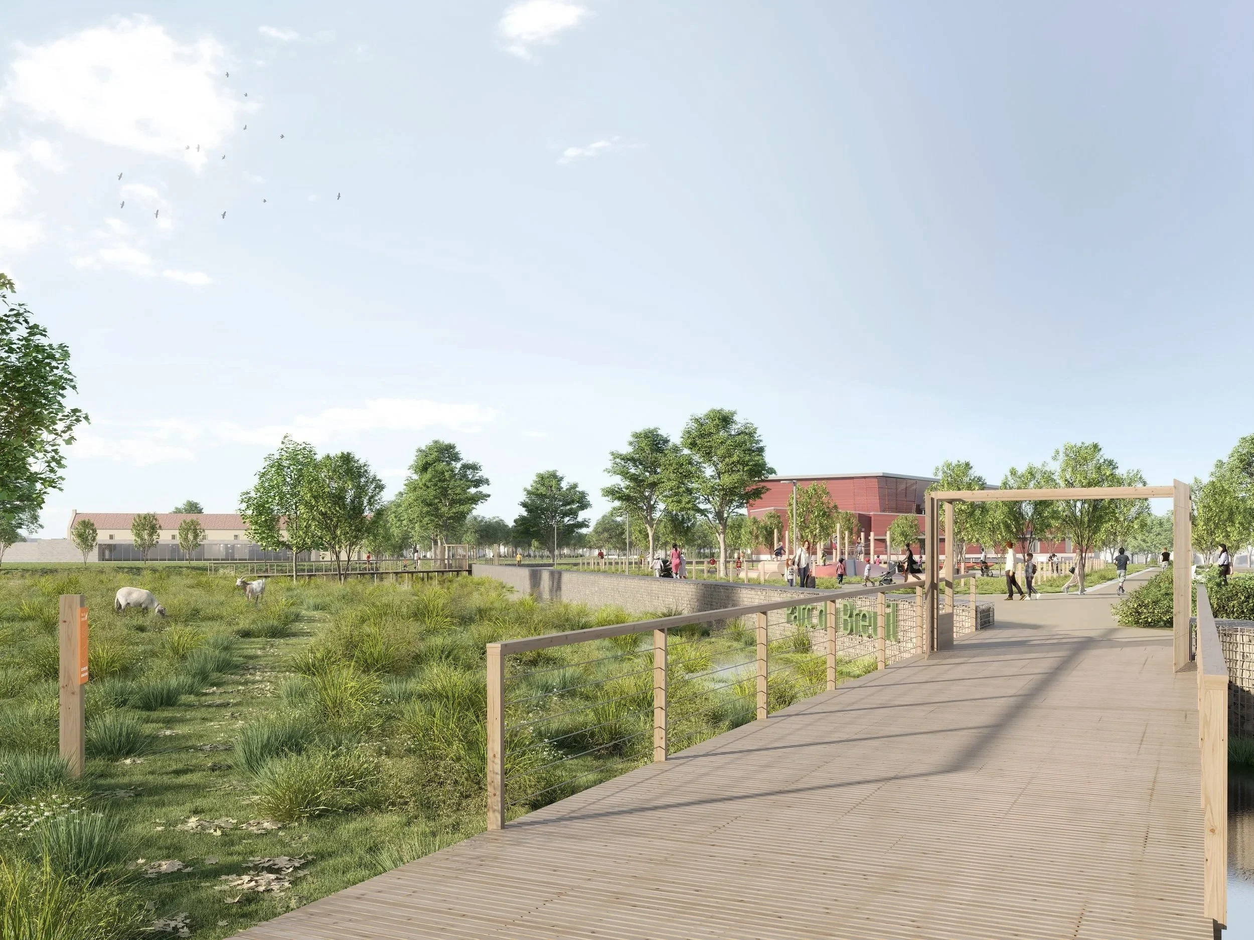 Les fonctions du parc sont déjà précisées : à l’ouest, l’esplanade festive accueille cérémonies et loisirs avec son pump-track et le parvis de la mairie ; la ferme pédagogique comprend potager, verger et pâturage ; la prairie humide régule l’eau hivernale et permet l’observation des oiseaux depuis des cabanes ; le bois complète le corridor écologique à l’échelle du territoire. Au nord, l’esplanade active entoure la Loco avec des jeux et agrès, tandis qu’au sud, la voie verte relie la commune à la gare de Mézidon-Canon et ouvre des percées sur le parc.