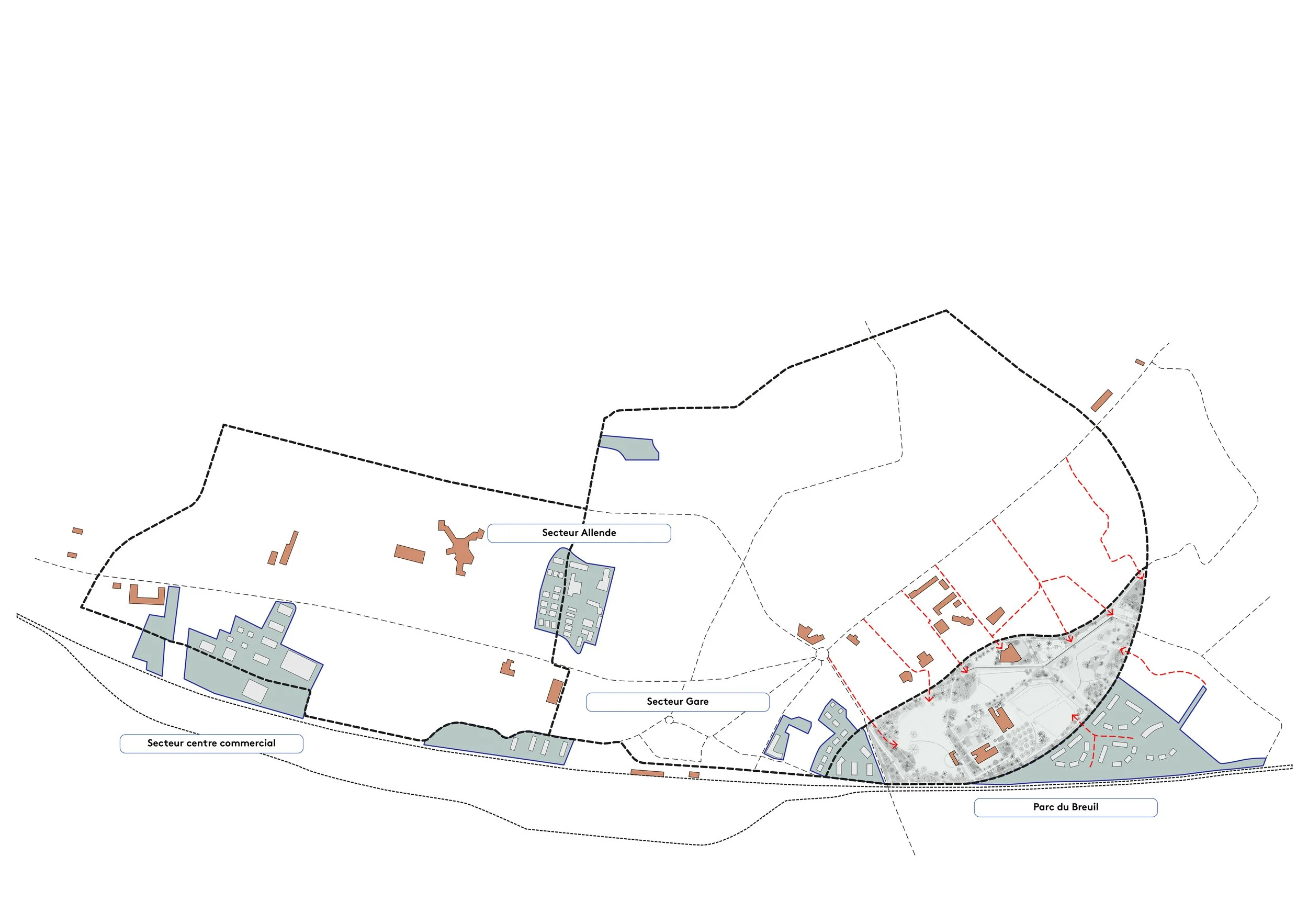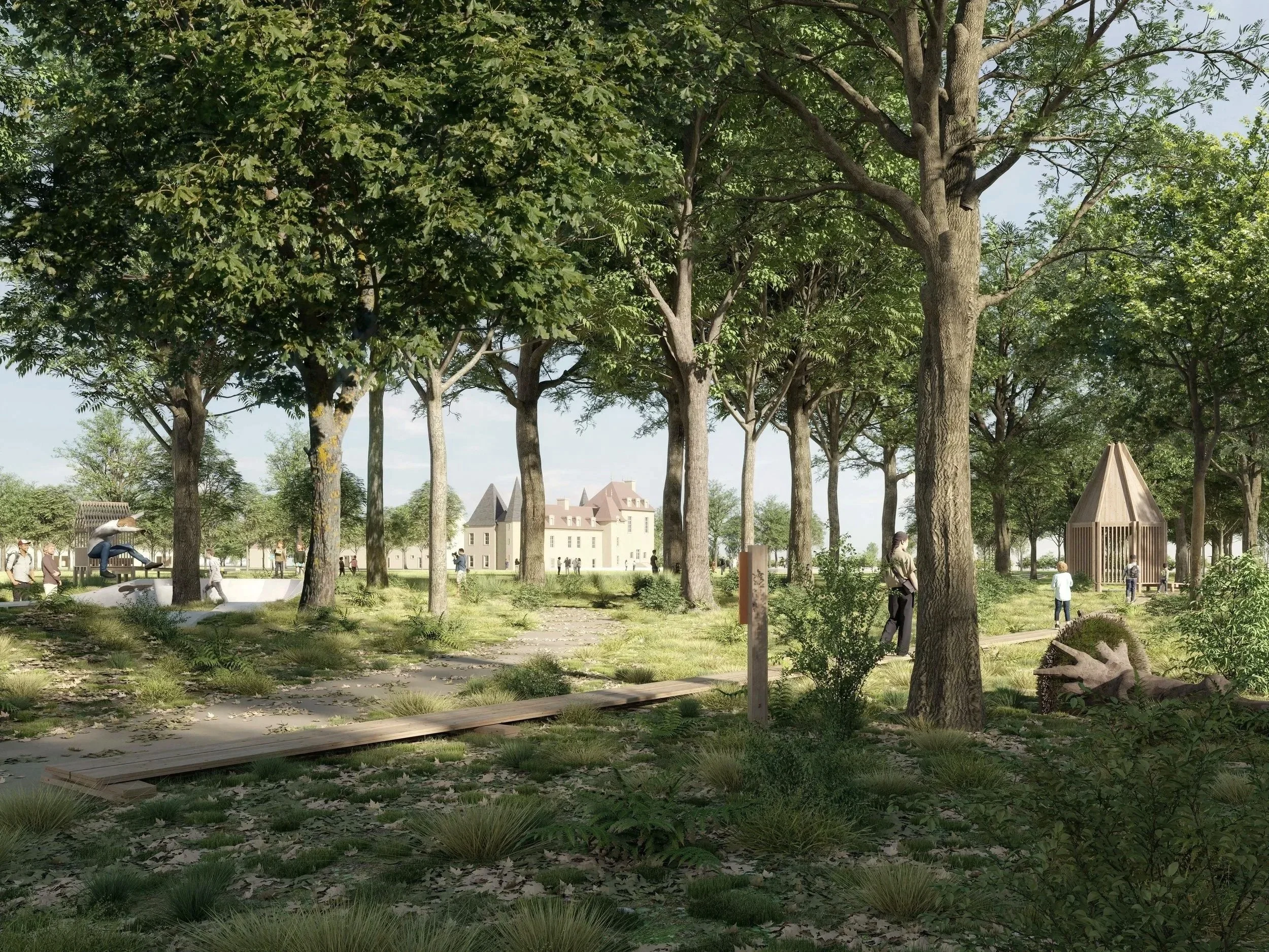 Quinze hectares, c’est vingt-deux stades de foot, quatre fois le jardin des Plantes à Caen et deux fois le parc Monceau à Paris ! Un site vaste, au programme dense et réfléchi. Après plusieurs visites et semaines de travail, notre équipe a constaté que de nombreux éléments précieux étaient déjà présents. Nous proposons donc un projet qui révèle plutôt qu’il n’ajoute, qui embellit avec simplicité et frugalité, en valorisant le “déjà-là”. Nous concentrons les interventions sur le pourtour du parc, laissant son centre presque sanctuarisé et naturel.