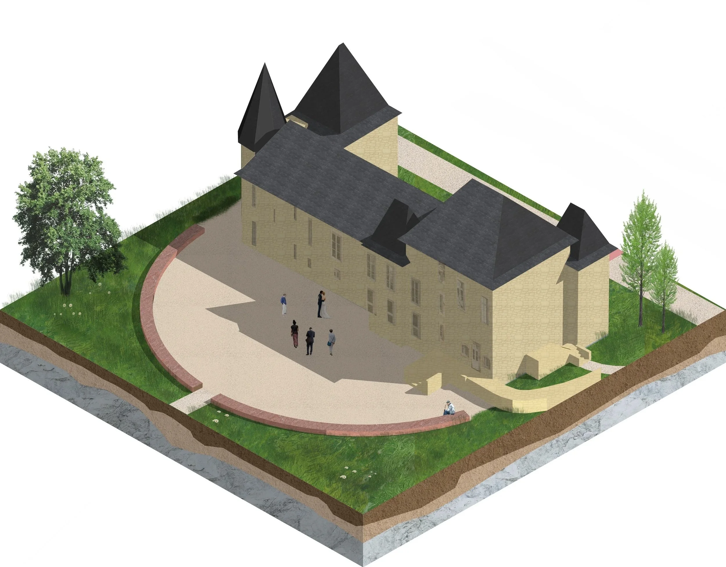 Le “déjà-là” constitue une ressource précieuse. Nous souhaitons révéler le paysage existant, respecter et valoriser le patrimoine tout en le transformant : la mairie en pierre rénovée, la ferme pédagogique en matériaux géosourcés et la Loco au bardage rouge composent une cour centrale ouverte sur le parc. Les relevés topographiques nous renseignent sur la végétation, les fossés, la gestion du ruissellement et le patrimoine architectural, offrant des bases solides pour le projet.