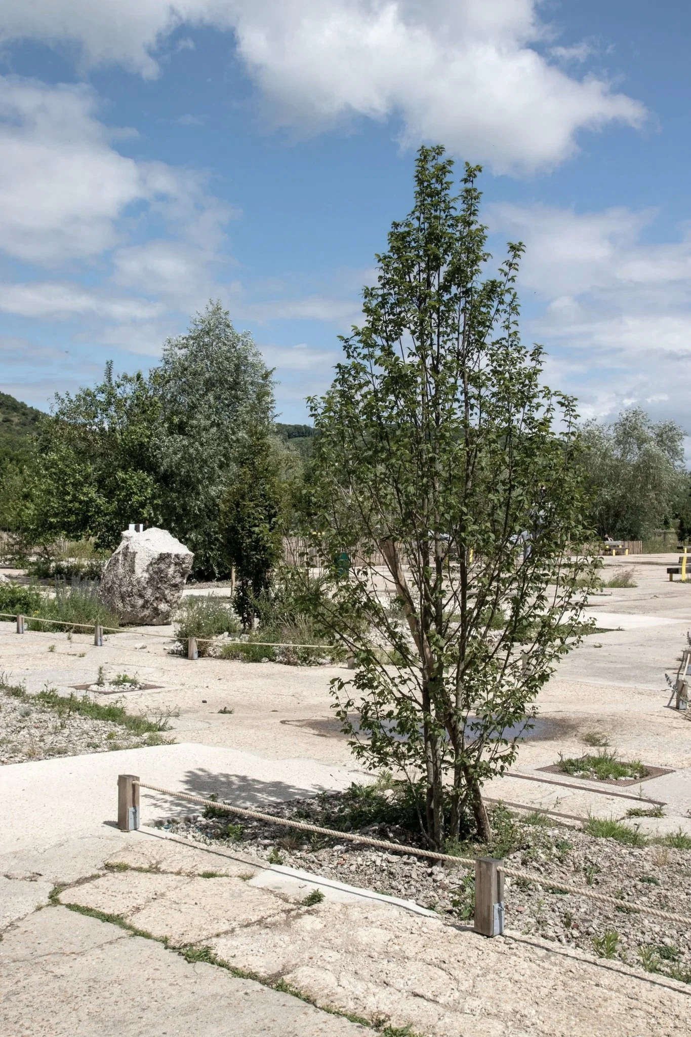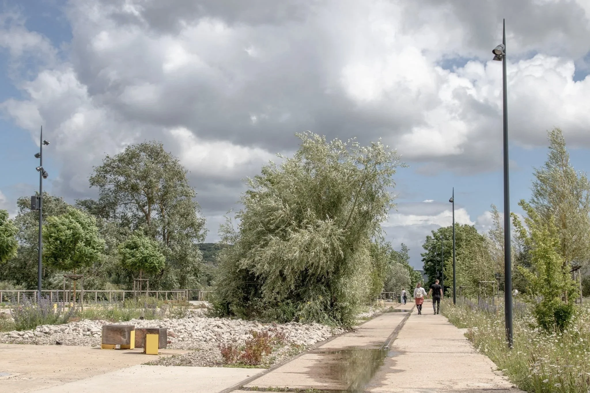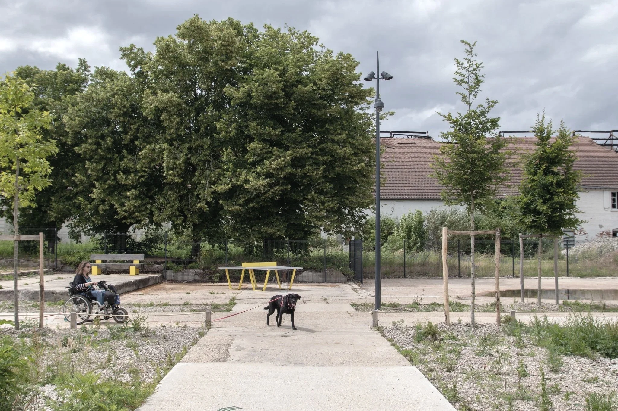 À l’opposé, le jardin sec reste ouvert en toute saison. Il s’appuie sur la dalle en béton de l’ancienne fonderie, réutilisée et ponctuellement perforée pour laisser éclore la végétation. Des essences sélectionnées contribuent à extraire et traiter les résidus de pollution encore présents dans le sol, alliant beauté et résilience écologique.