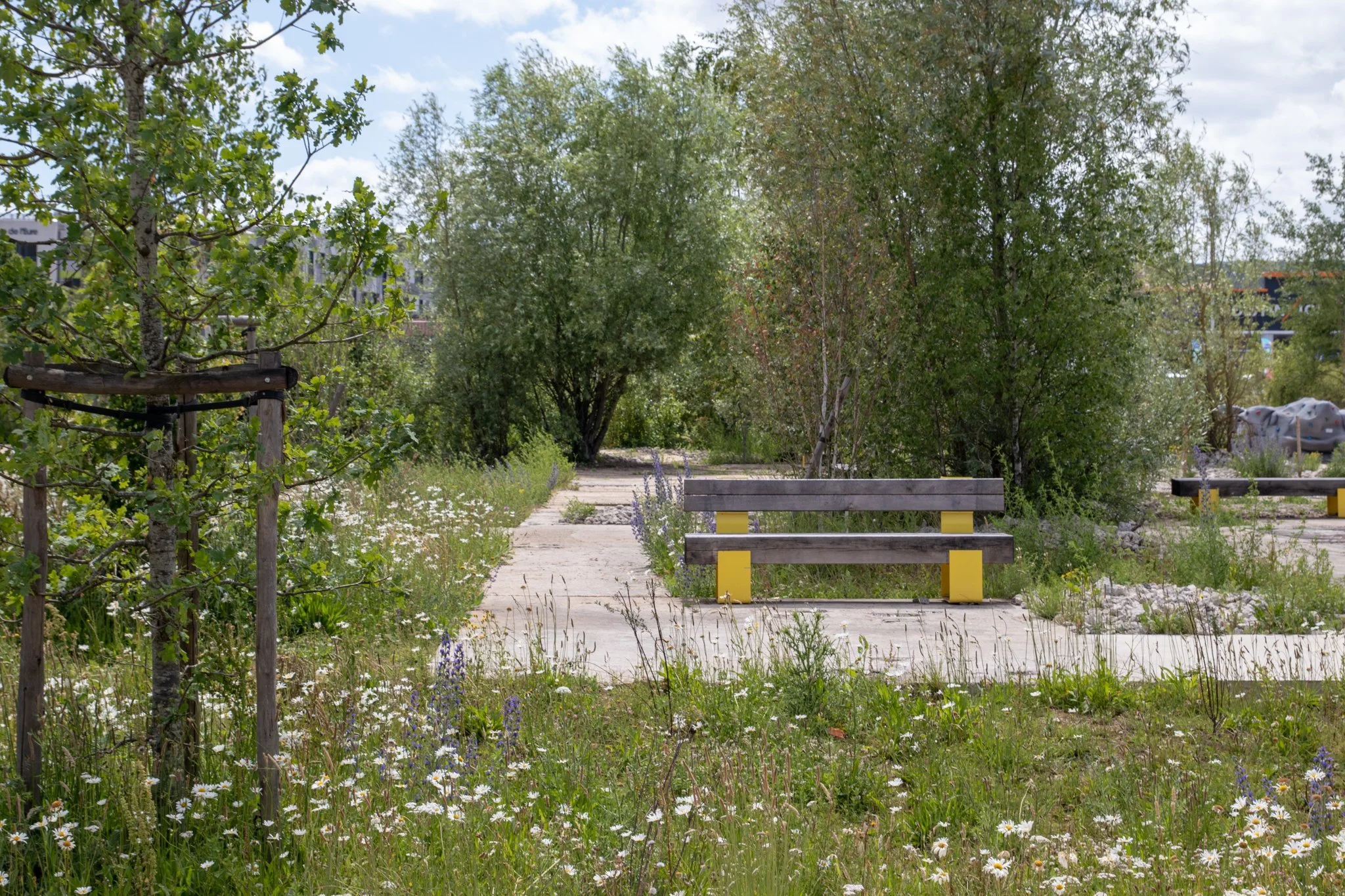 Le jardin résilient, posé sur l’ancienne dalle béton, conjugue renaturation et usages variés.