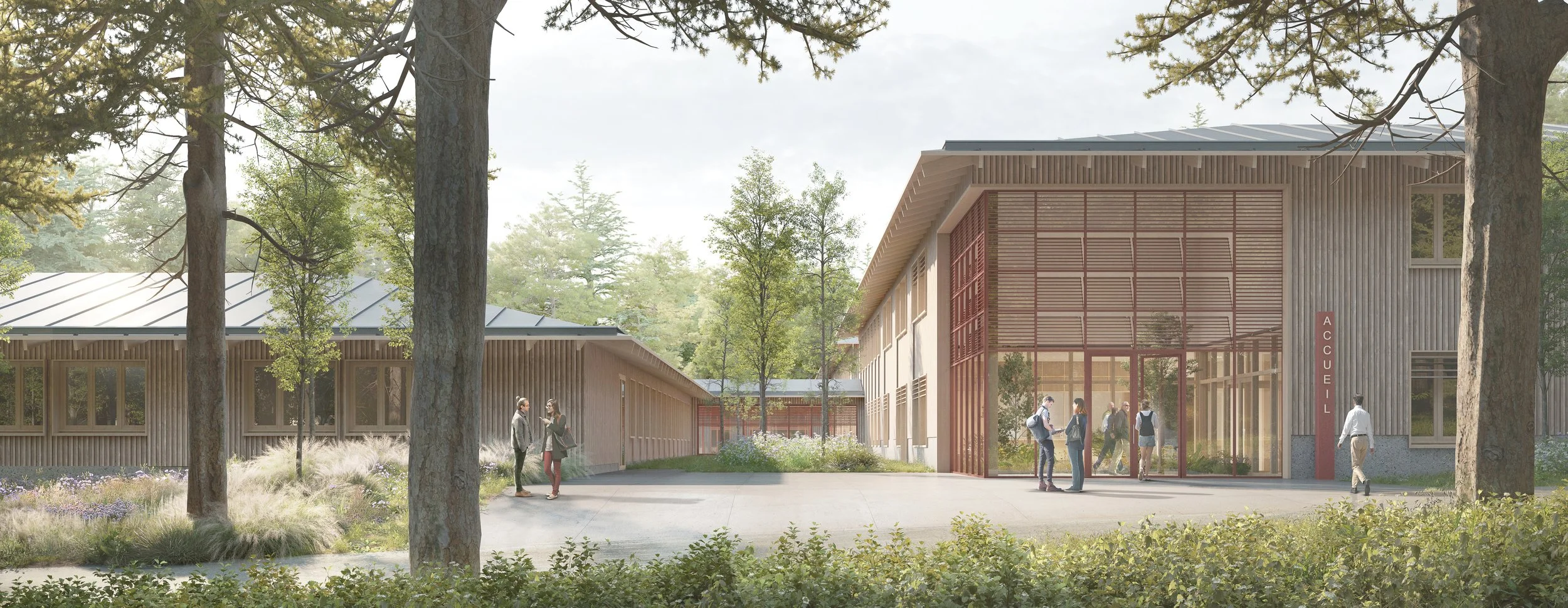Le projet paysager vise à créer un lien fort entre le bâtiment et son environnement, en assurant une continuité entre intérieur et extérieur, dans une démarche durable et respectueuse de la biodiversité. Les aménagements privilégient les sols perméables, la gestion écologique des eaux pluviales (noues, jardins de pluie) et la valorisation du maillage végétal existant, complété par des plantations adaptées et non allergènes. Le site est organisé autour de plusieurs échelles :