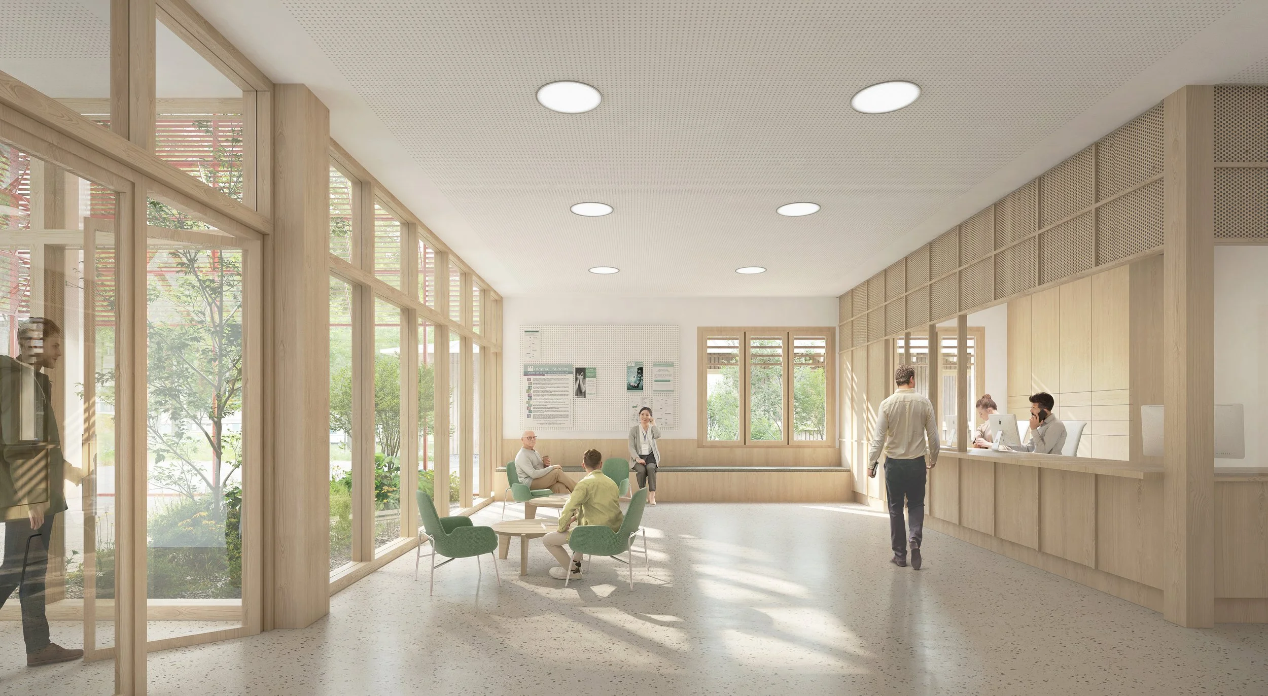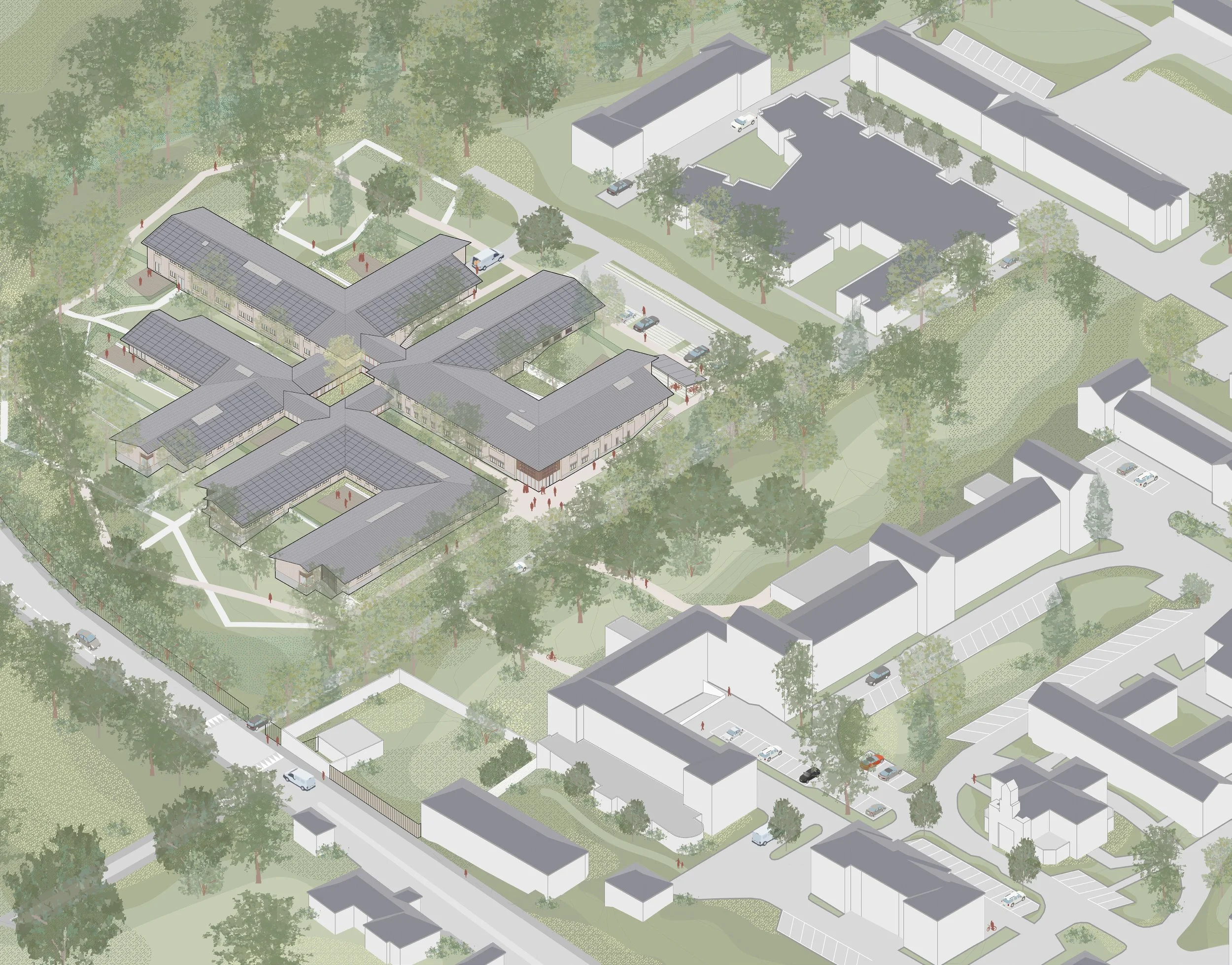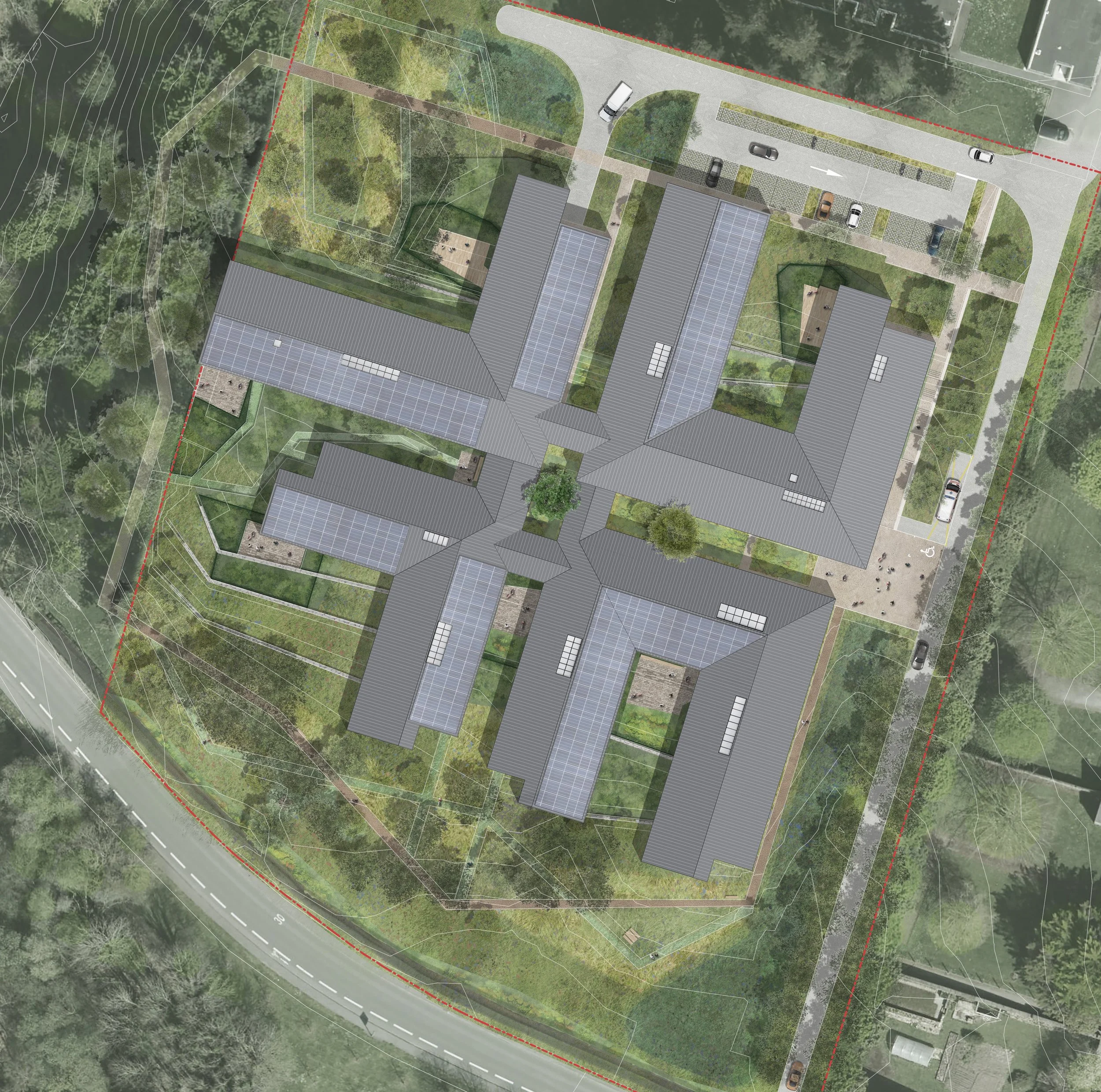 L’ensemble du projet cherche à offrir des espaces extérieurs qualitatifs, intégrés, sécurisés et thérapeutiques, favorisant le confort des patients tout en participant à la biodiversité et à la qualité environnementale du site.