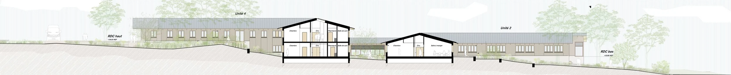 L’aménagement extérieur suit le mouvement du bâtiment, réparti sur deux niveaux de rez-de-chaussée pour s’adapter au dénivelé important. La moitié nord forme un plateau au niveau du RDC haut, tandis que la partie sud descend progressivement depuis le RDC bas pour rejoindre la topographie existante. Des talus viennent en outre assurer un apport de lumière naturelle et des vues sur le paysage pour les chambres du rez-de-chaussée exposées au nord. La voie à l’est reste inchangée, à l’exception d’une rampe aménagée pour l’accès des ambulances.