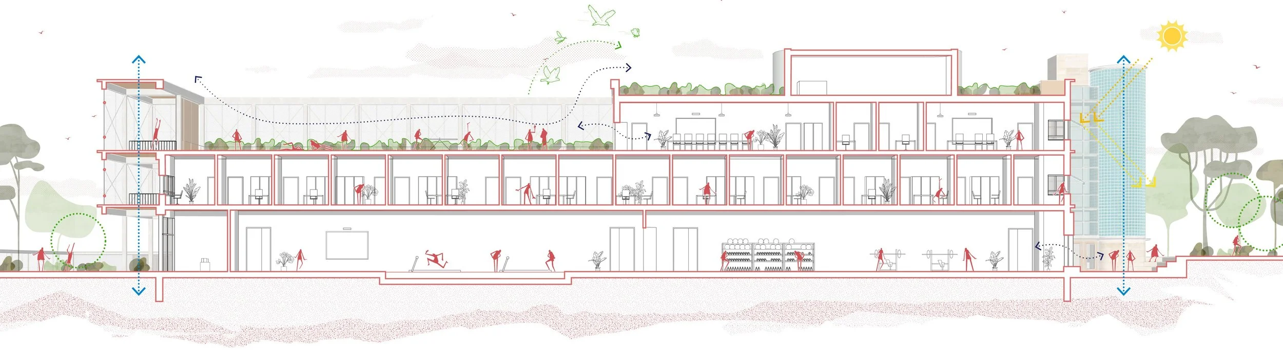 Le projet de paysage de l’UFR STAPS cherche à tisser un lien harmonieux entre architecture et nature, offrant une continuité douce entre espaces intérieurs et extérieurs dans une démarche durable. Il s’articule autour de trois piliers : le sol, l’ambiance végétale et la gestion des eaux pluviales. Le sol, aujourd’hui partiellement imperméable et peu végétalisé, sera revitalisé par un enrichissement de la terre, garantissant la pérennité des aménagements et le plein épanouissement des végétaux, tandis qu’une voie douce, ondulant légèrement avec le relief, invite à la déambulation.