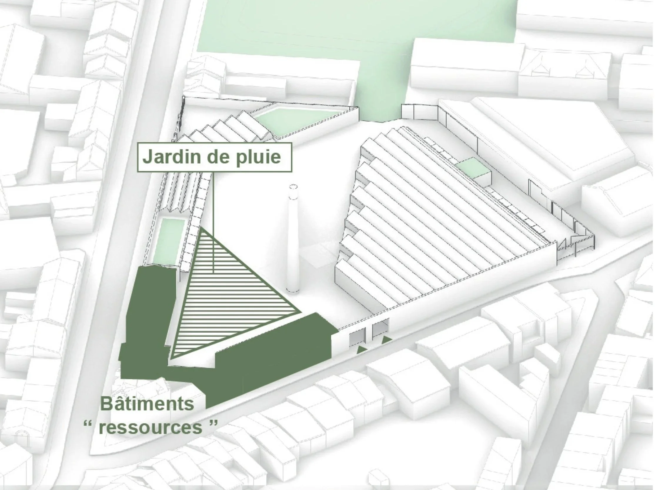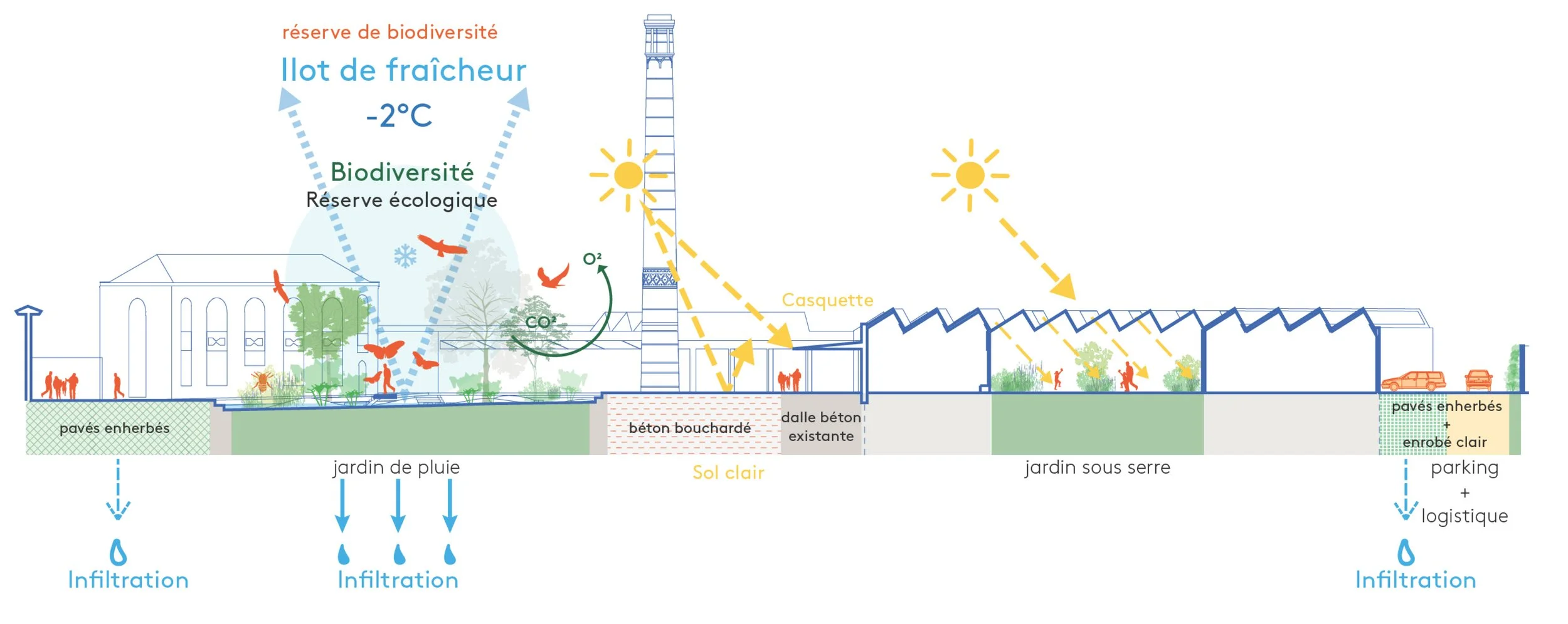 Programme : Friche / Jardin de pluie / Grand parvis / Mail piétonnier / Serre / Réemploi / Jardin intérieur / Palette végétale / Toiture végétalisée / Biodiversité
