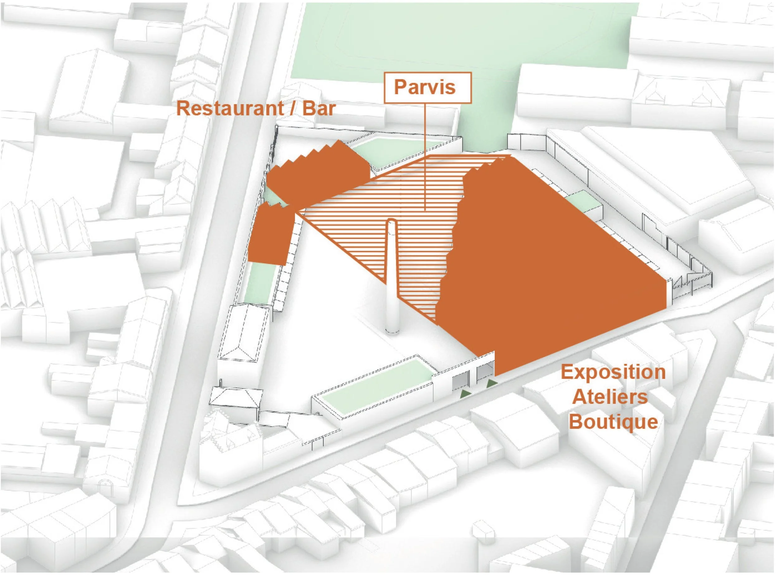 L’axe central du projet permet d’imaginer une longue esplanade minérale, qui met en valeur la cheminée par sa matérialité. Au sol, le dessin du plan du bâtiment déconstruit permet d’assurer une continuité historique tel un palimpseste. Comme un tapis rouge, le visiteur est guidé dans son parcours.