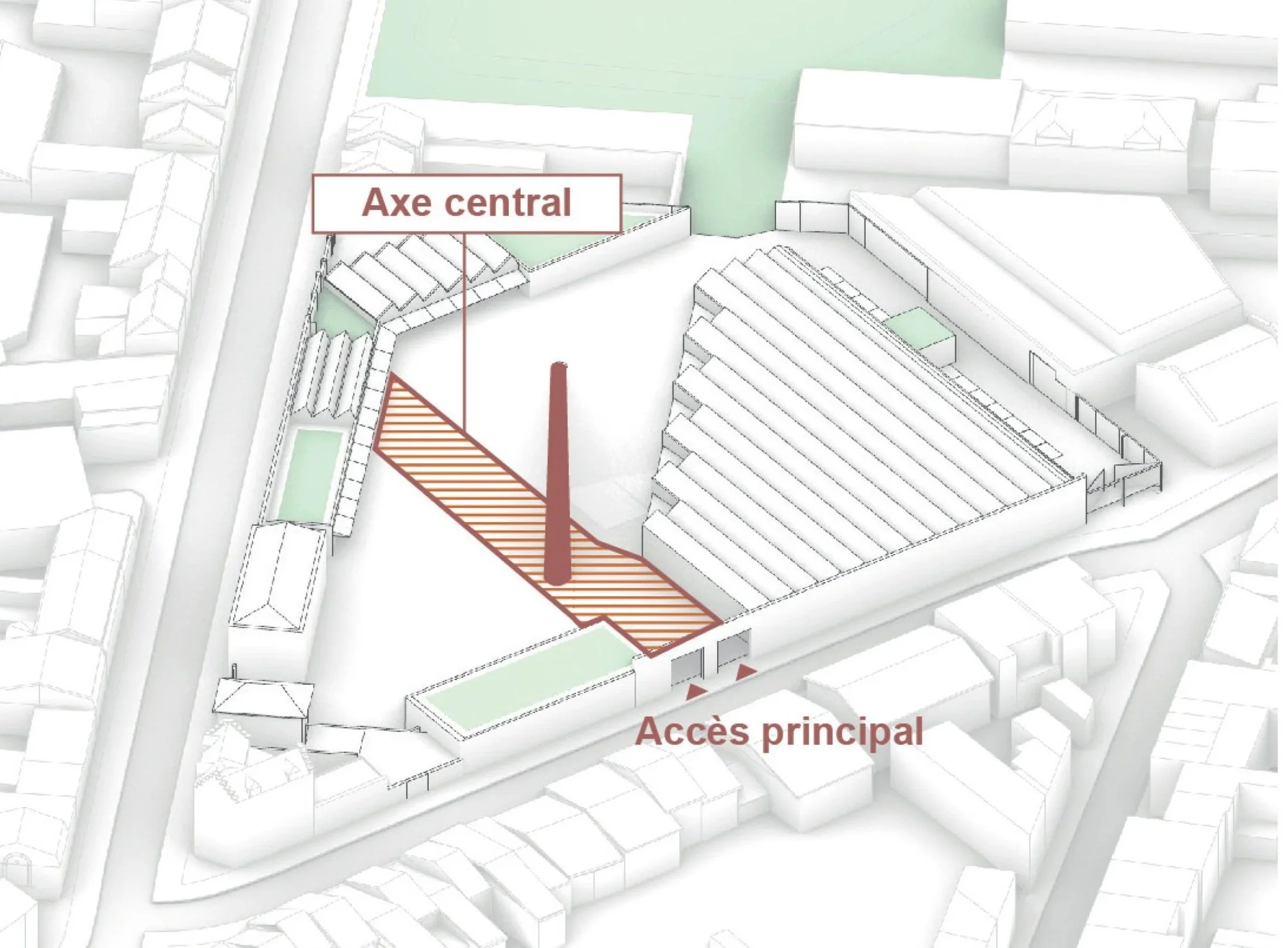 L’architecture s’inscrit dans le respect du patrimoine existant. Les toits en sheds, emblématiques de l’architecture industrielle du Nord, seront conservés, restaurés et réemployés, tout comme la grande cheminée, symbole et mémoire du site. Les démolitions restent limitées et ciblées, afin d’ouvrir l’îlot, de hiérarchiser les éléments remarquables et de recomposer un ensemble clair, lisible et cohérent.
