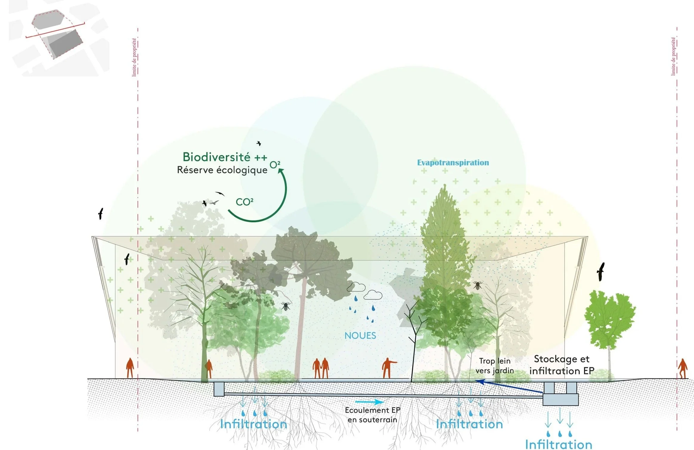 Les deux futurs bâtiments s’implanteront sur une emprise précédemment occupée par des stationnements, des espaces de stockage en plein air et une base vie, sur un sol totalement artificialisé et dépourvu de végétation. Le projet paysager vise à restaurer la perméabilité du sol et à créer un jardin de pluie immersif, capable de stocker et d’infiltrer naturellement les eaux pluviales tout en offrant un refuge pour la biodiversité locale.