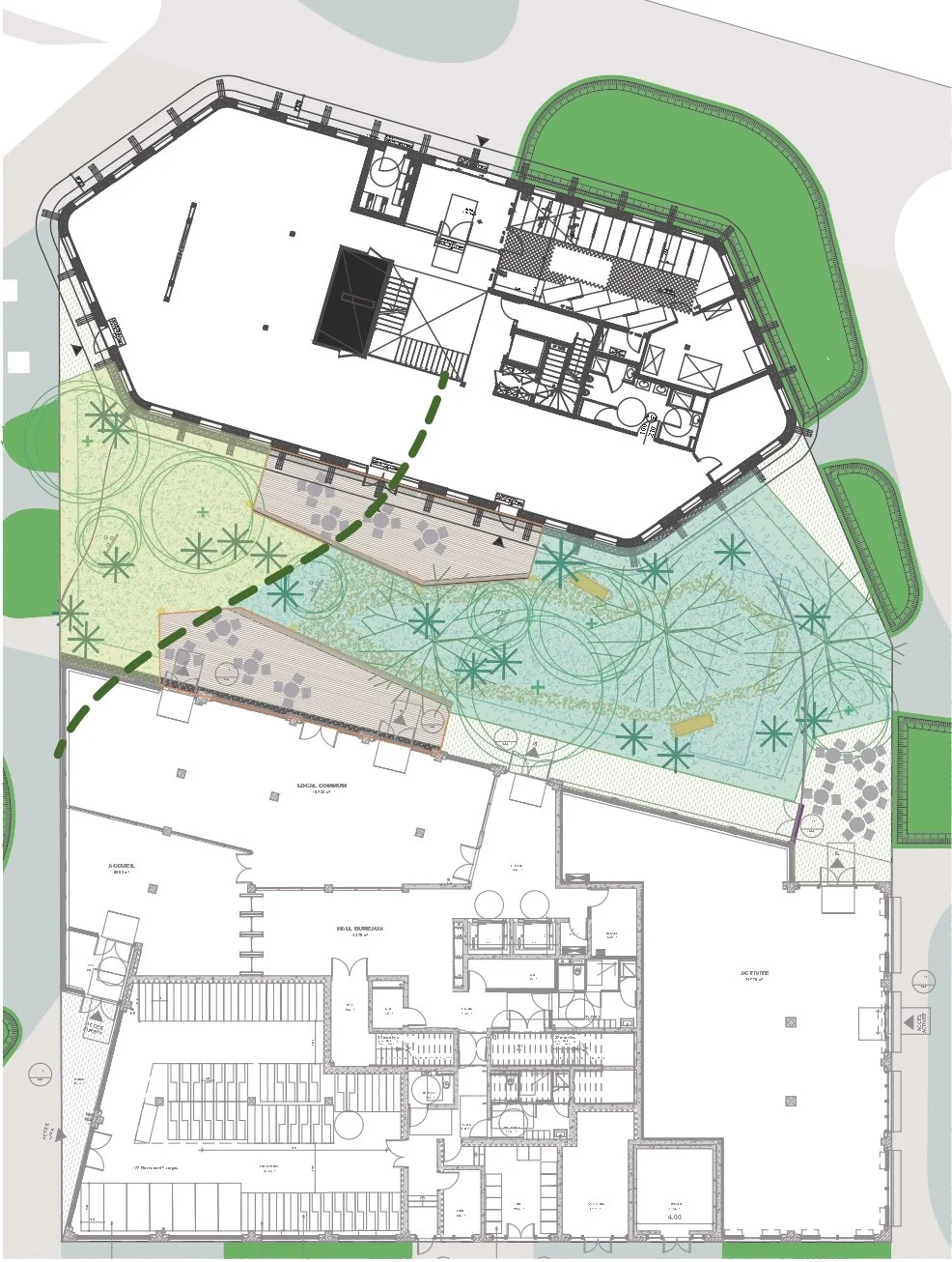 Ce cœur d’îlot est pensé comme un espace fluide de travail et de détente, où une végétation dense et stratifiée préserve l’intimité tout en ouvrant le regard sur l’environnement urbain. Enfin, l’intégration de dispositifs écologiques tels que nichoirs et hôtels à insectes renforce l’insertion du projet dans la trame verte du quartier.