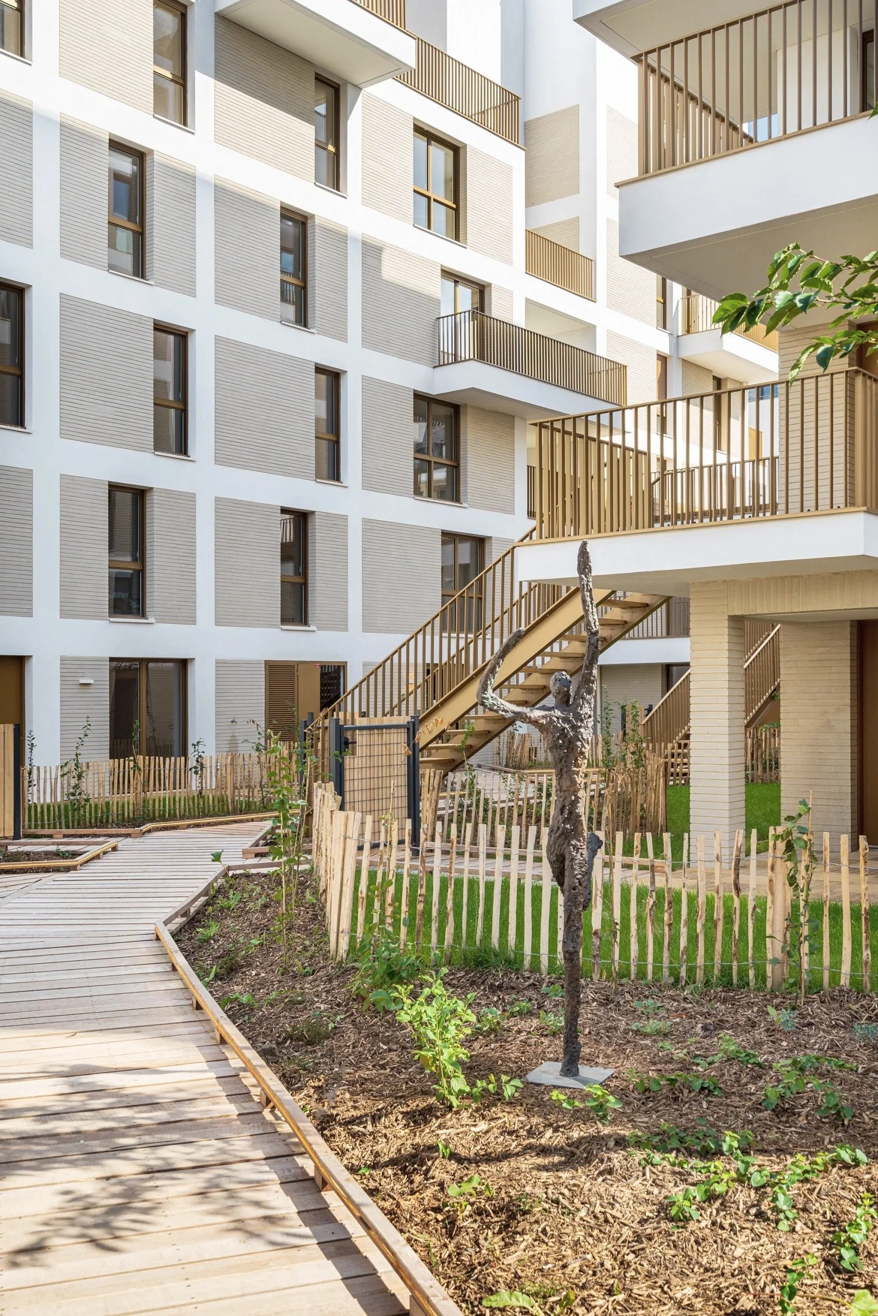 L’aménagement intérieur privilégie une composition organique, avec un réseau de sentiers sinueux serpentant entre les différents accès et les façades des immeubles. Le jardin est également ponctué de zones de transition et de placettes, judicieusement disposées pour offrir des espaces de respiration aux résidents.