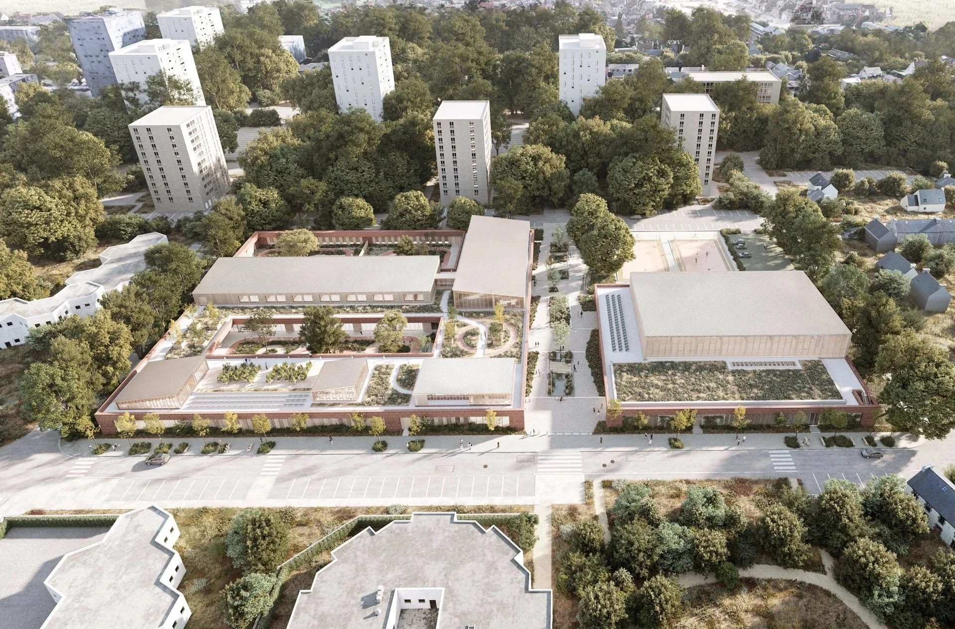 Les constructions de faible hauteur apparaissent composées d’un socle d’un seul niveau sur lequel sont posés des volumes aux toitures inclinées. Le socle accueille une nappe végétalisée sur l’ensemble des bâtiments offrant ainsi un paysage à l’échelle du quartier en symbiose avec les aménagements du mail et des cours de récréation. Le paysagement d’ensemble, visible depuis les immeubles environnants, constitue l’étoffe d’un urbanisme durable invitant la nature en ville et affirmant l’idée d’une « ville parc ».