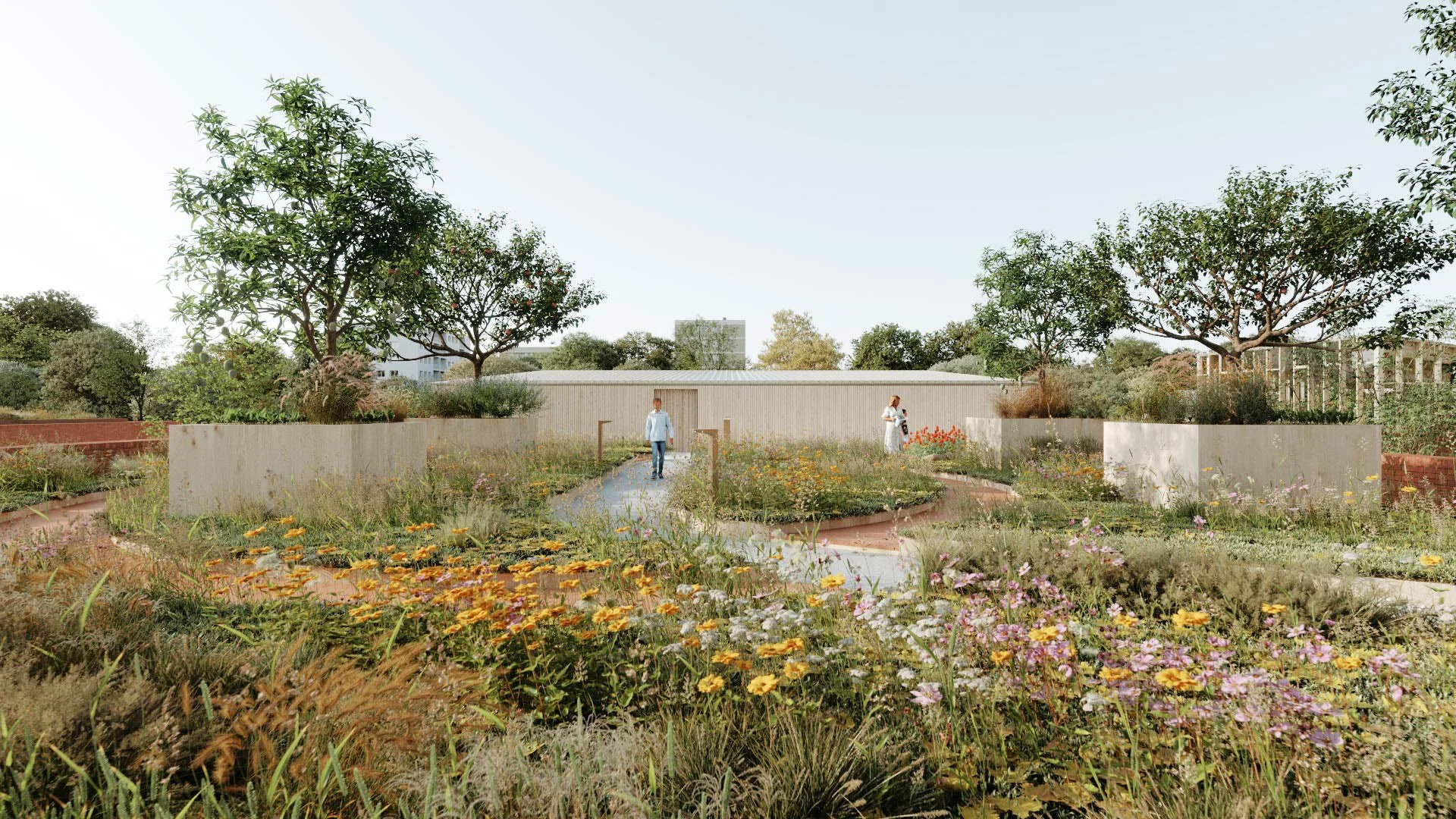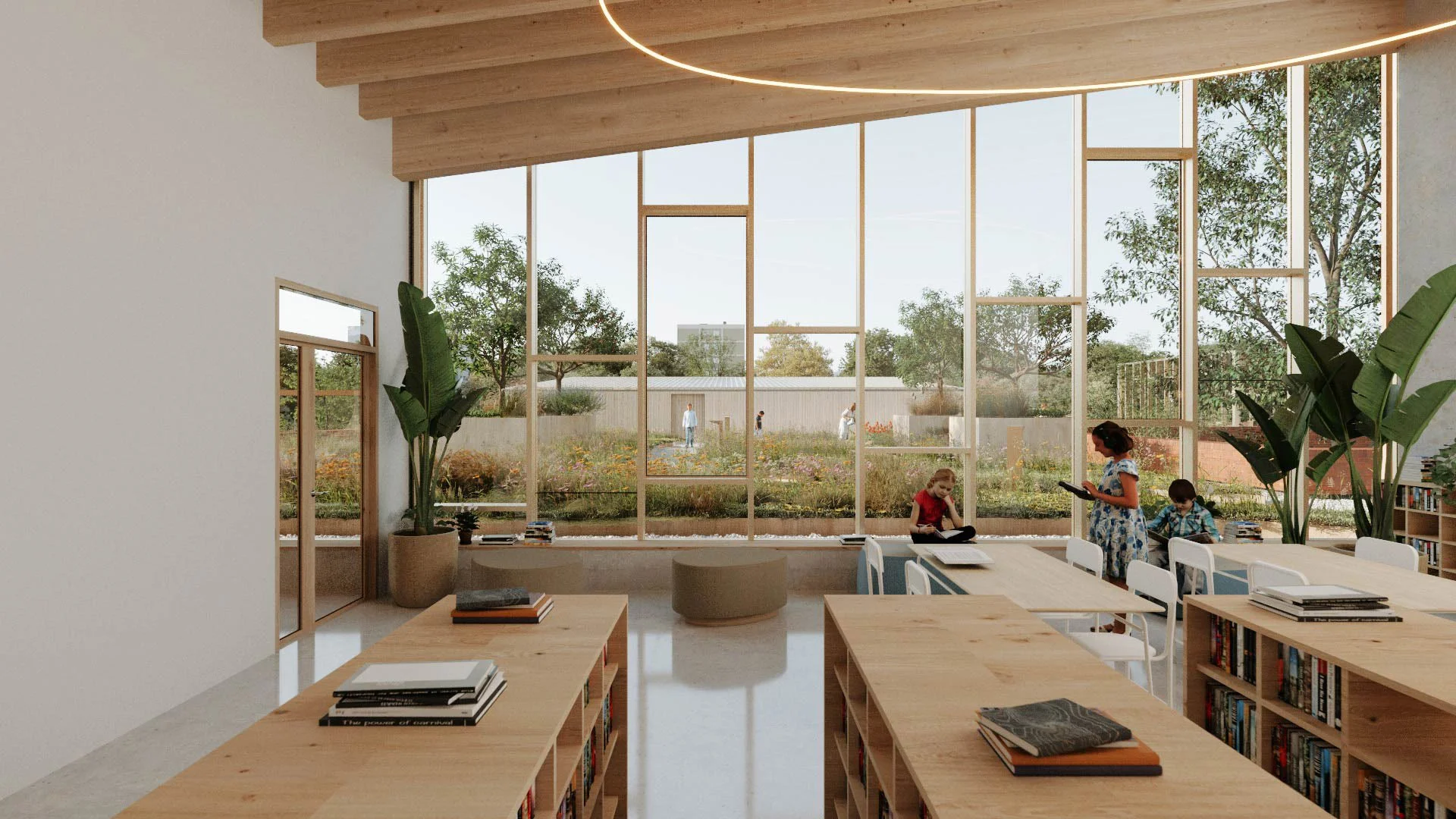 Programme : Mail piétonnier / Toiture végétalisée / Ilot de fraîcheur / Biodiversité / Gestion des eaux pluviales / Prairie fleurie / Parcours pédagogique / Coulée verte