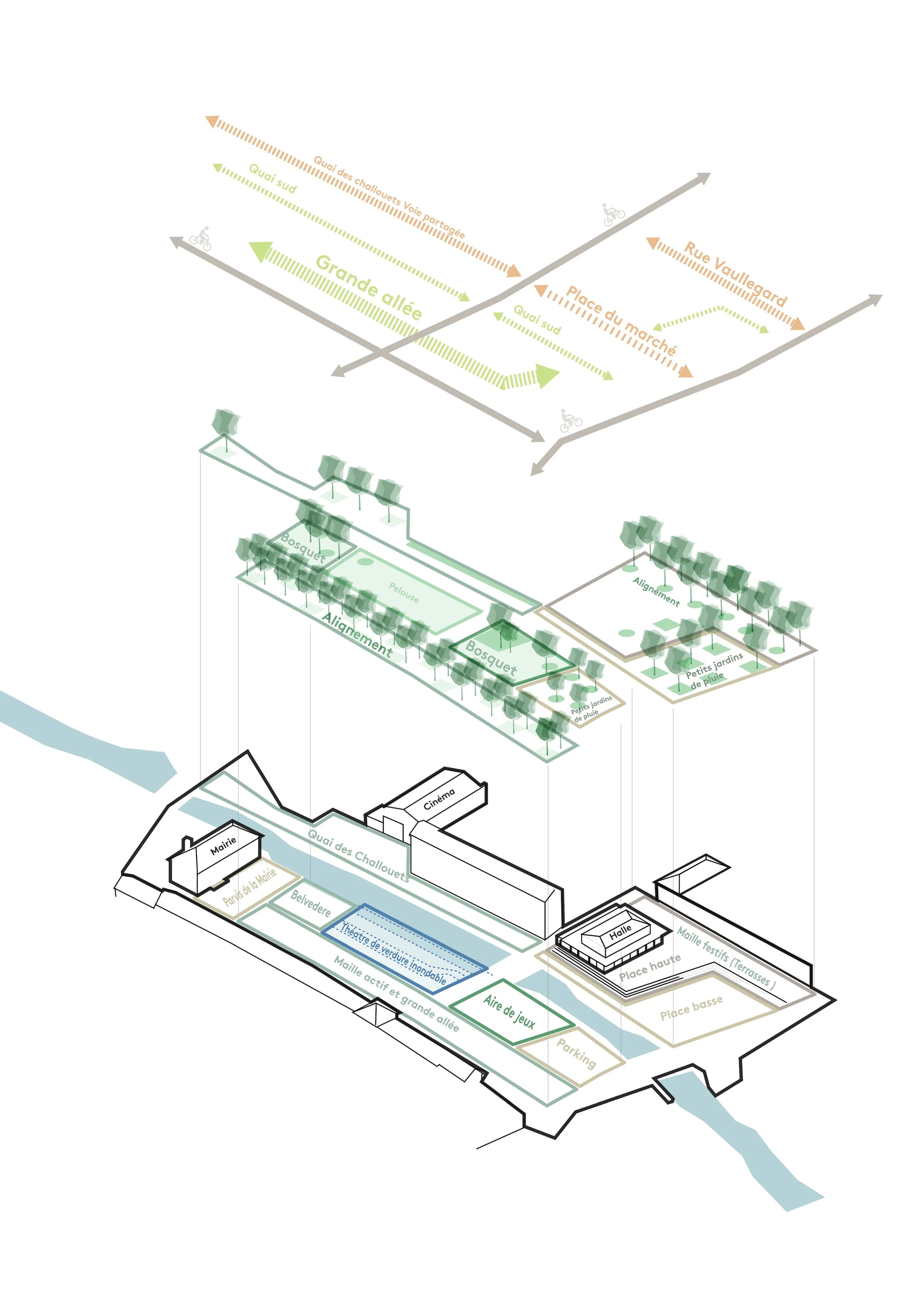 Notre volonté est de concevoir un projet pour les habitants de Condé-sur-Noireau qui puisse répondre aux exigences du quotidien tout en offrant un lieu de vie commun dont le cœur en serait la Halle et sa place. Construit à l’image des grands parcs urbains de centre-ville, la Halle serait alors le kiosque de ce grand jardin naturel et urbain dans lequel les habitants de Condé-sur-Noireau pourraient tout à la fois vaquer à leurs occupations quotidiennes, s’amuser et se détendre, le tout dans une nature omniprésente et abondante.