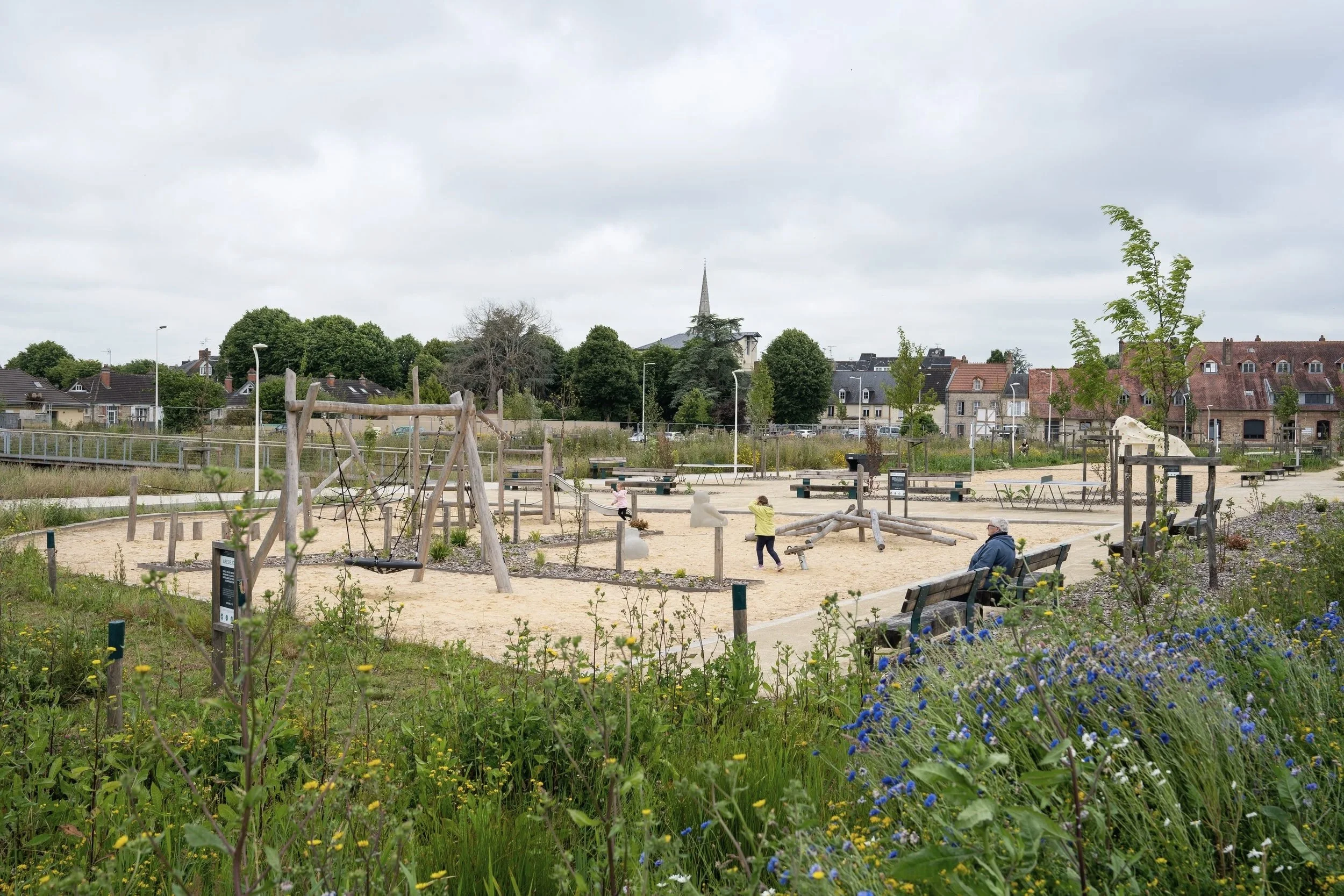 Programme : Friche industrielle / Prairie inondable / Parc paysager / Aire de jeux / Berges / Mobilier urbain / Éco-quartier