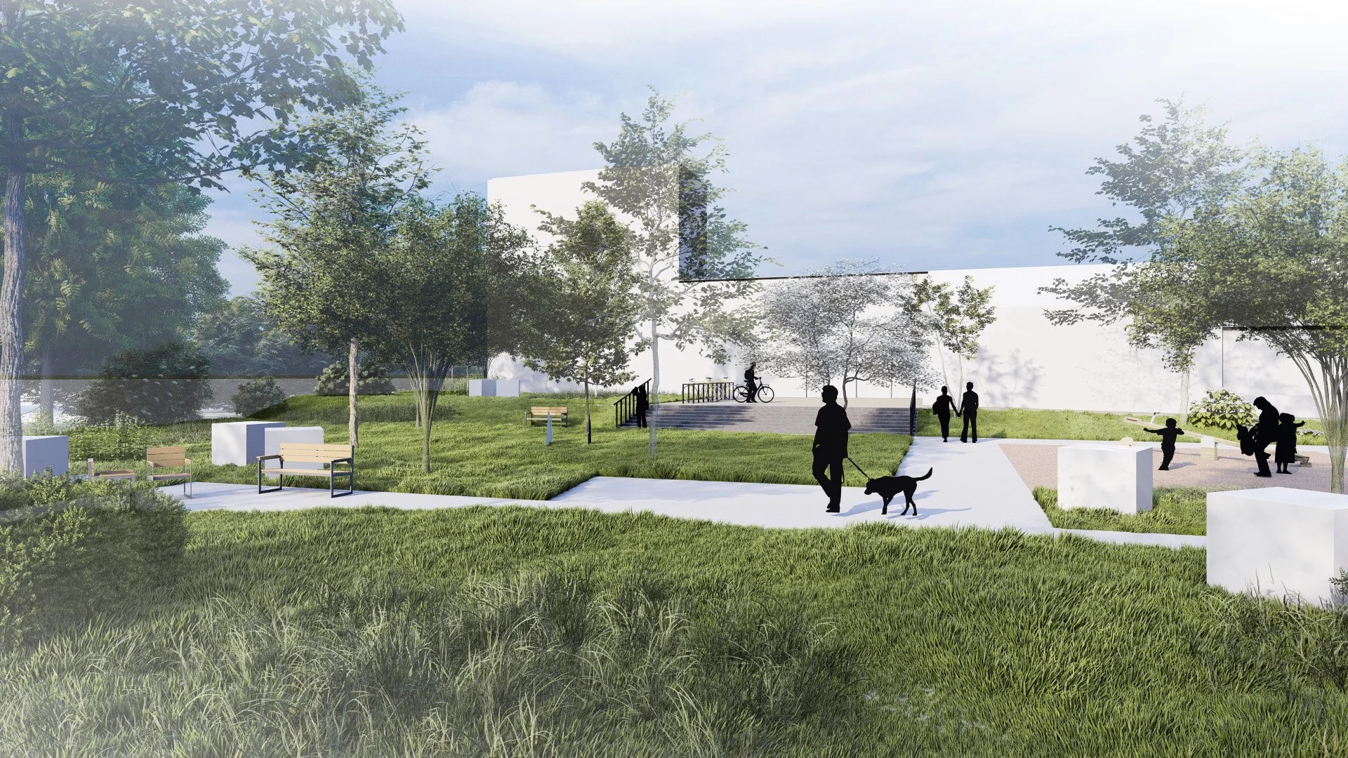 Au nord du site, des dalles béton existantes sont sciées et démolies afin de végétaliser ce qui deviendra un parc densément arboré offrant de nouveaux usages aux habitants de la commune (terrain de basket 3x3, aire de jeux pour les plus petits, espaces de pelouses ensoleillées et ombragées, mobilier de confort), et de nouveaux habitats pour la faune existante.