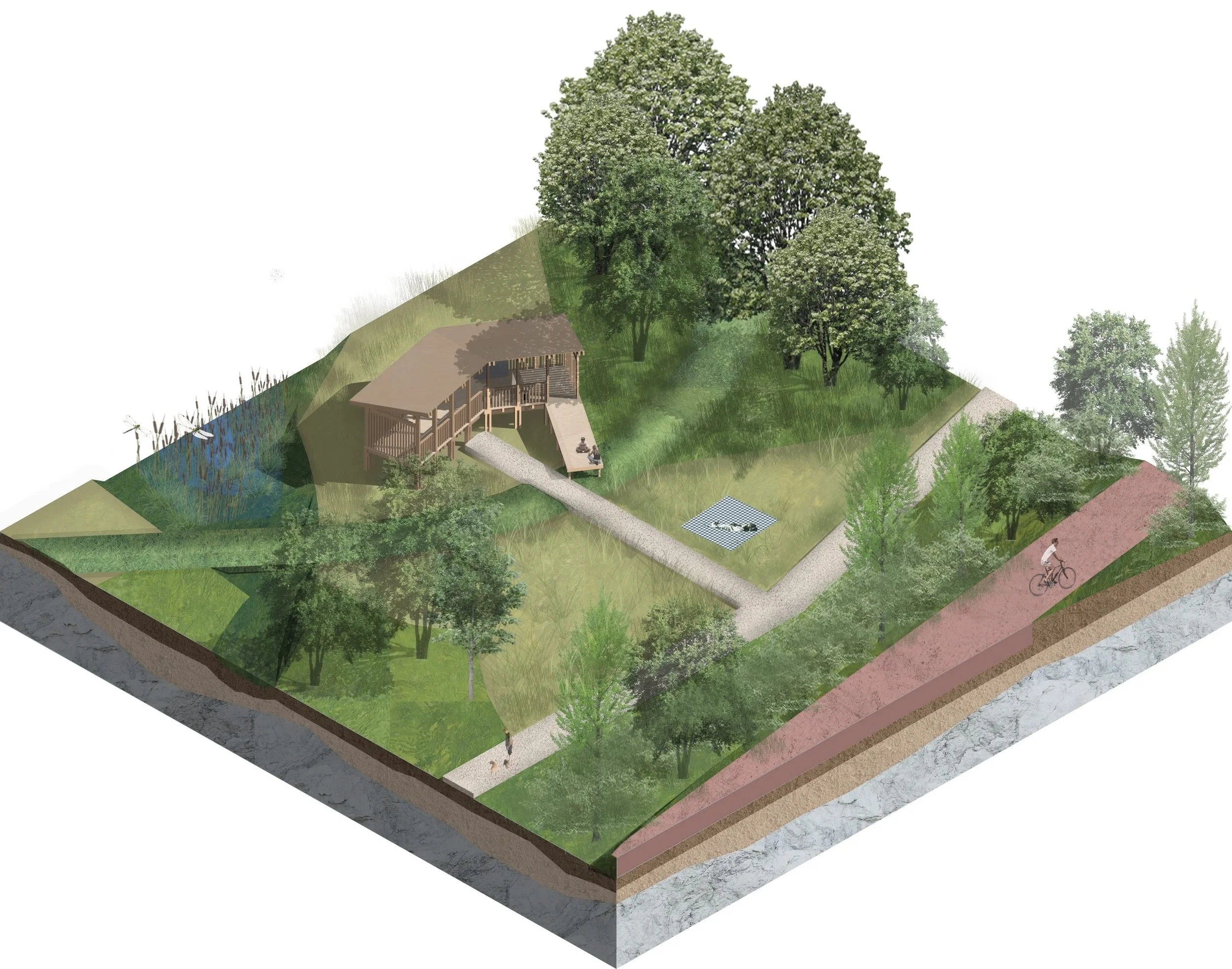 Notre plan de composition repose sur quatre thèmes : le sol, l’eau, le végétal et les usages, afin de mettre en musique le vivant souvent invisible. L’objectif est double : offrir aux habitants un lieu de vie et créer un espace naturel riche en biodiversité et en fonctions écologiques.