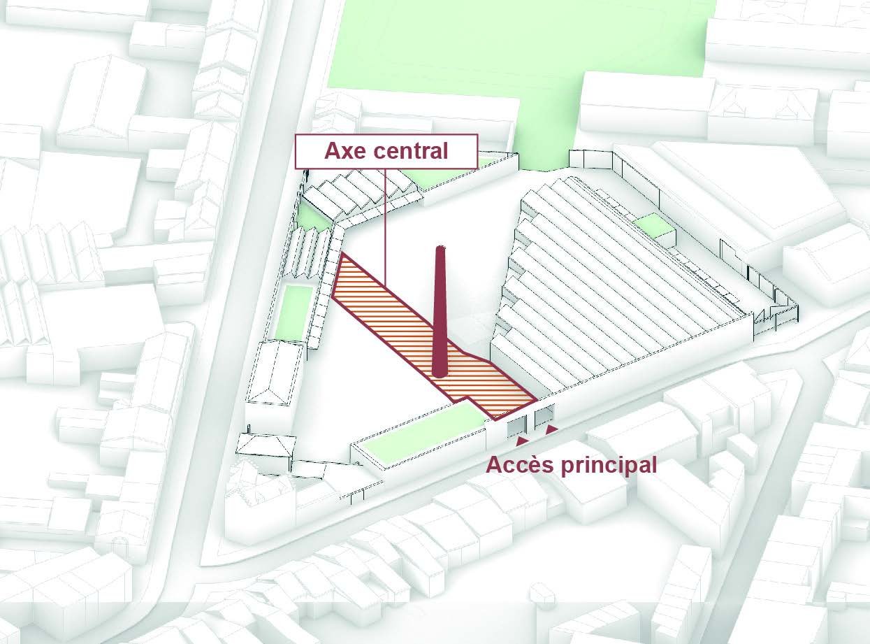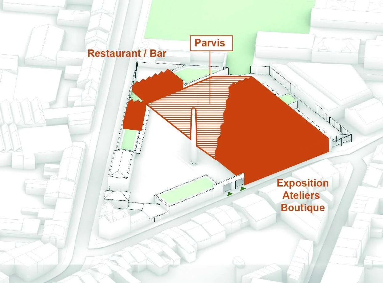L’axe central du projet permet d’imaginer une longue esplanade minérale, qui met en valeur la cheminée par sa matérialité. Au sol, le dessin du plan du bâtiment déconstruit permet d’assurer une continuité historique tel un palimpseste. Comme un tapis rouge, le visiteur est guidé dans son parcours.