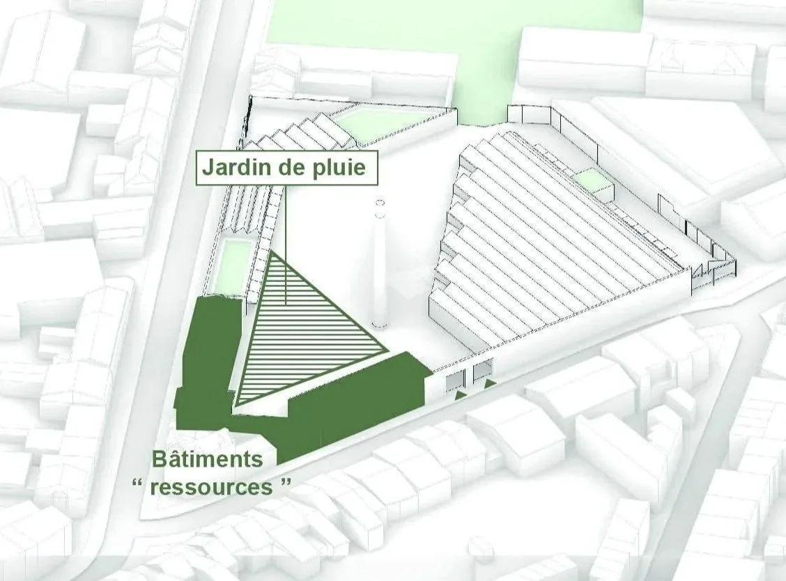 Programme : Friche / Jardin de pluie / Grand parvis / Mail piétonnier / Serre / Réemploi / Jardin intérieur / Palette végétale / Biodiversité