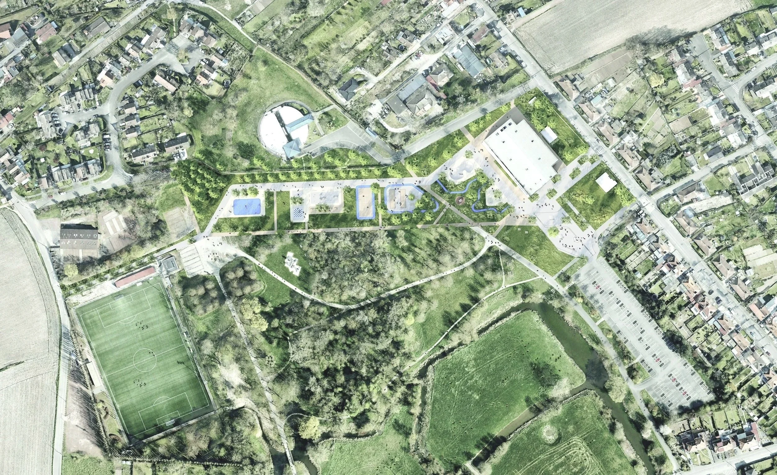 Le site de la plaine de jeux se situe à l’intersection de l’espace urbain et de l’espace naturel, constituant un lieu stratégique de transition entre ces deux milieux habituellement distincts. Il s’intègre comme un maillon dans un réseau nord-sud reliant des points clés du centre-ville — la gare, la mairie, le futur cœur de ville, le parc des Ansereuilles — à la Deûle.