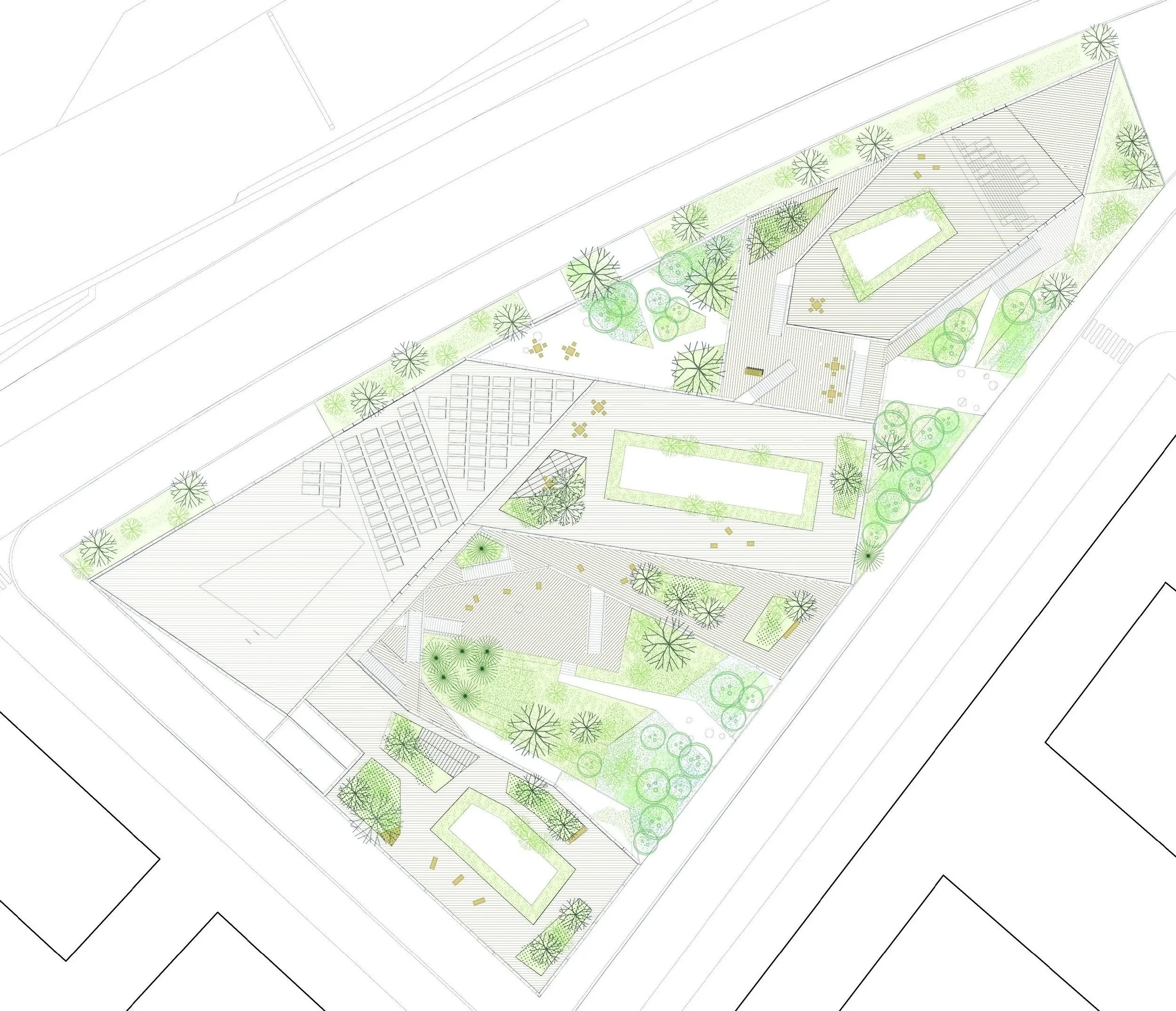 Le paysage contemplatif s’exprime au sol, dans la relation entre le bâtiment et la rue. Inspiré des milieux humides de la Saône, il structure la gestion des eaux pluviales à l’échelle de la parcelle. Ce paysage bas, composé d’une végétation de taille modeste, crée des vis-à-vis permanents entre l’intérieur et l’espace public, rappelant la proximité du fleuve malgré l’absence de contact visuel direct.